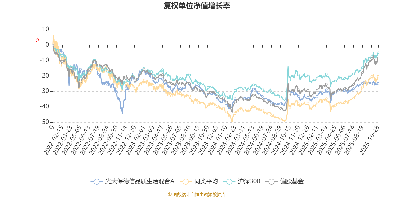 截至10月28日,光大保德信品质生活混合A近三个月复权单位净值增长率为1.89%,位于同类可比基金577/621;近半年复权单位净值增长率为9.15%,位于同类可比基金584/619;近一年复权单位净值增长率为7.97%,位于同类可比基金562/611;近三年复权单位净值增长率为31.74%,位于同类可比基金157/518。