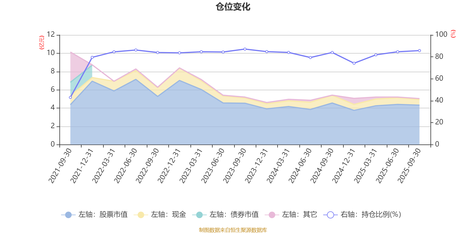 据定期报告数据统计,近三年平均股票仓位为83.22%,同类平均为85.66%。2023年三季度末基金达到87.1%的最高仓位,2021年三季度末最低,为43.04%。