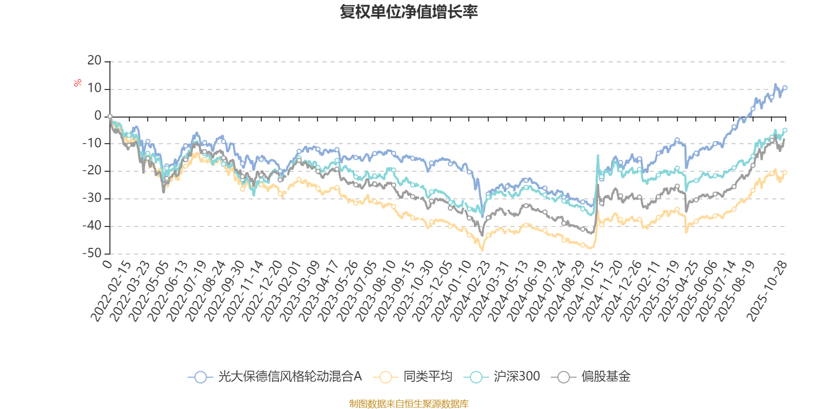 截至10月28日,光大保德信风格轮动混合A近三个月复权单位净值增长率为11.32%,位于同类可比基金390/689;近半年复权单位净值增长率为28.83%,位于同类可比基金322/688;近一年复权单位净值增长率为34.98%,位于同类可比基金196/653;近三年复权单位净值增长率为37.16%,位于同类可比基金68/364。