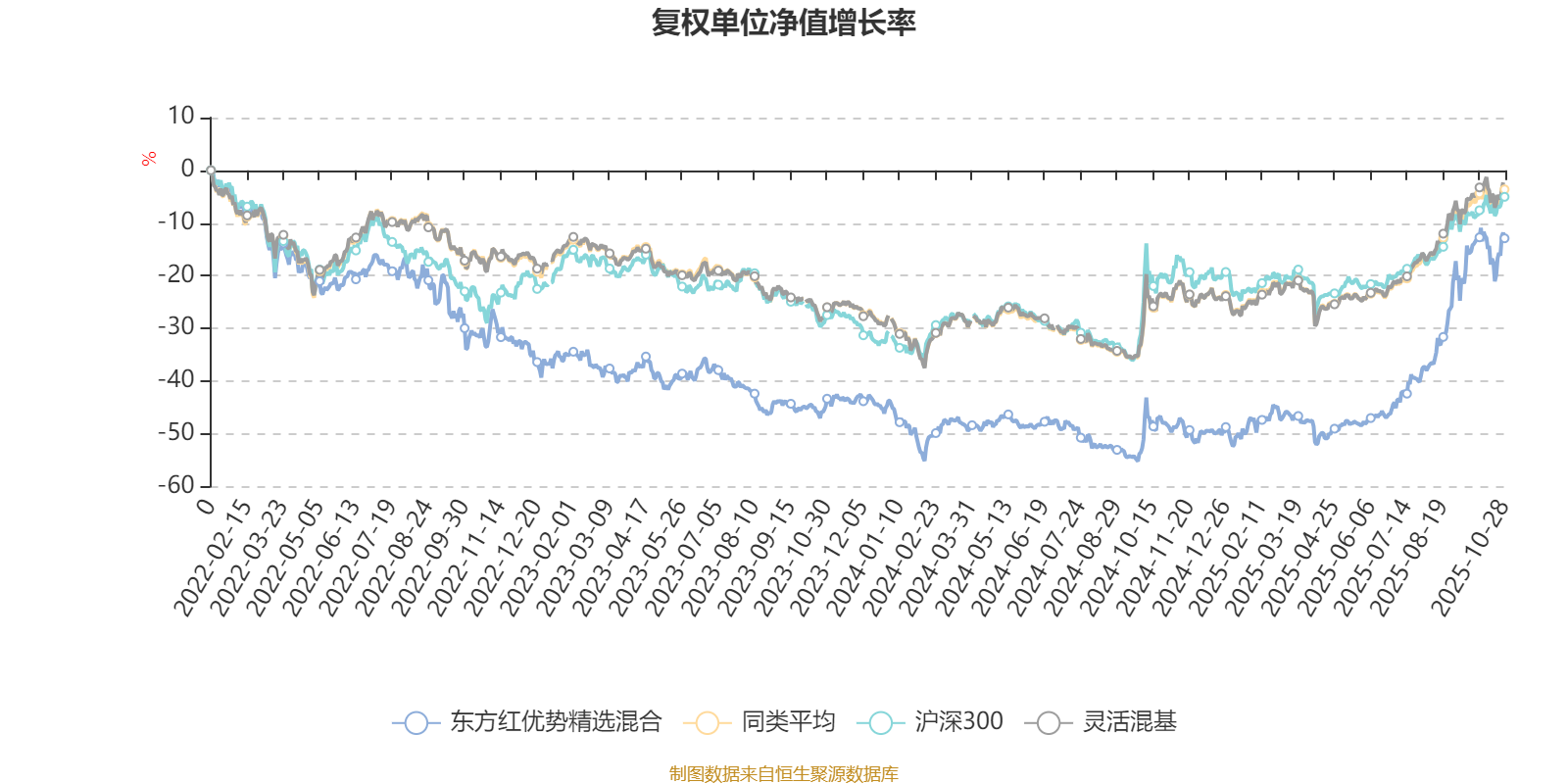 截至10月28日,东方红优势精选混合近三个月复权单位净值增长率为42.80%,位于同类可比基金66/1287;近半年复权单位净值增长率为72.17%,位于同类可比基金66/1287;近一年复权单位净值增长率为67.54%,位于同类可比基金72/1287;近三年复权单位净值增长率为30.79%,位于同类可比基金357/1286。