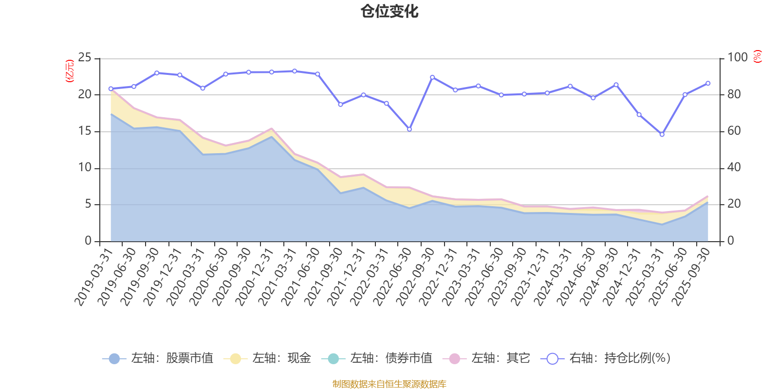 据定期报告数据统计,近三年平均股票仓位为79.36%,同类平均为72.35%。2021年一季度末基金达到93.05%的最高仓位,2025年一季度末最低,为58.44%。