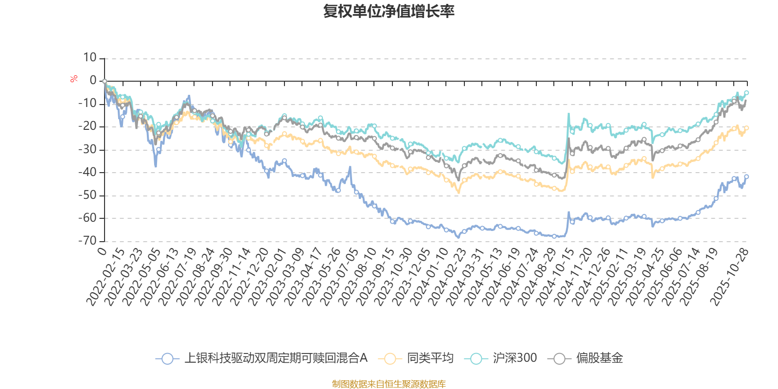 截至10月28日,上银科技驱动双周定期可赎回混合A近三个月复权单位净值增长率为29.23%,位于同类可比基金84/689;近半年复权单位净值增长率为50.34%,位于同类可比基金78/688;近一年复权单位净值增长率为44.37%,位于同类可比基金114/653;近三年复权单位净值增长率为-14.43%,位于同类可比基金325/364。