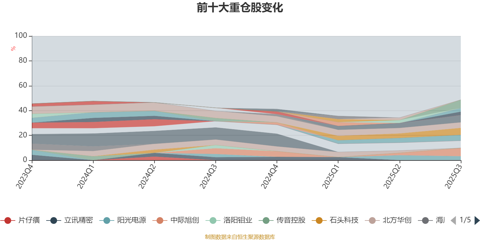 截至2025年三季度末,基金十大重仓股分别是中际旭创、新易盛、东方财富、恒瑞医药、澜起科技、汇川技术、比亚迪、阳光电源、天孚通信、先导智能。