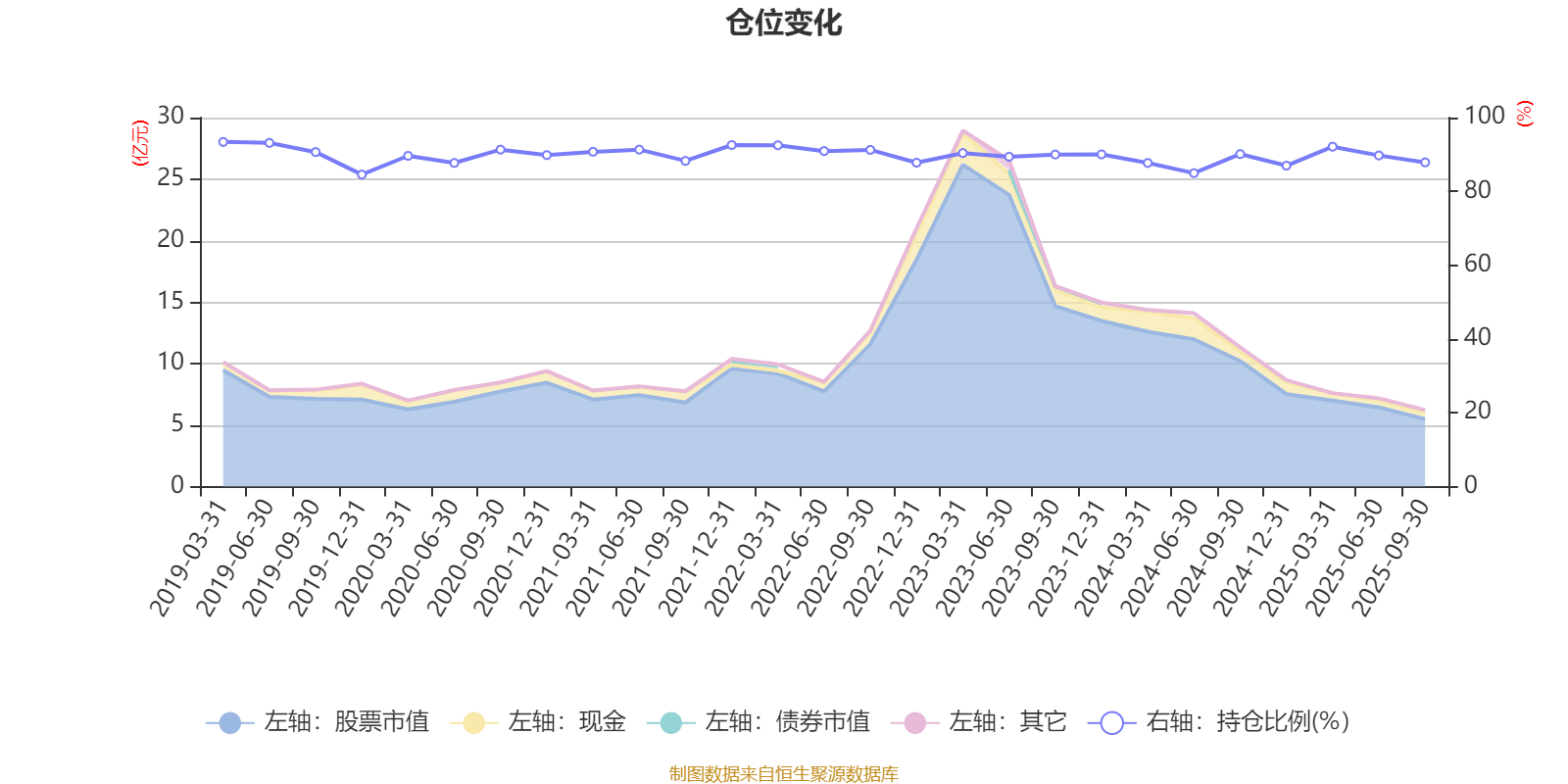 据定期报告数据统计,近三年平均股票仓位为88.92%,同类平均为85.99%。2019年一季度末基金达到93.4%的最高仓位,2019年末最低,为84.56%。