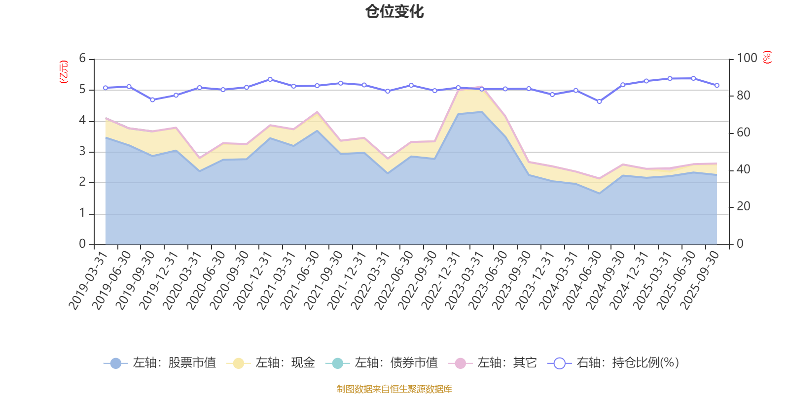 据定期报告数据统计,近三年平均股票仓位为84.75%,同类平均为85.66%。2025年上半年末基金达到89.63%的最高仓位,2024年上半年末最低,为77.16%。