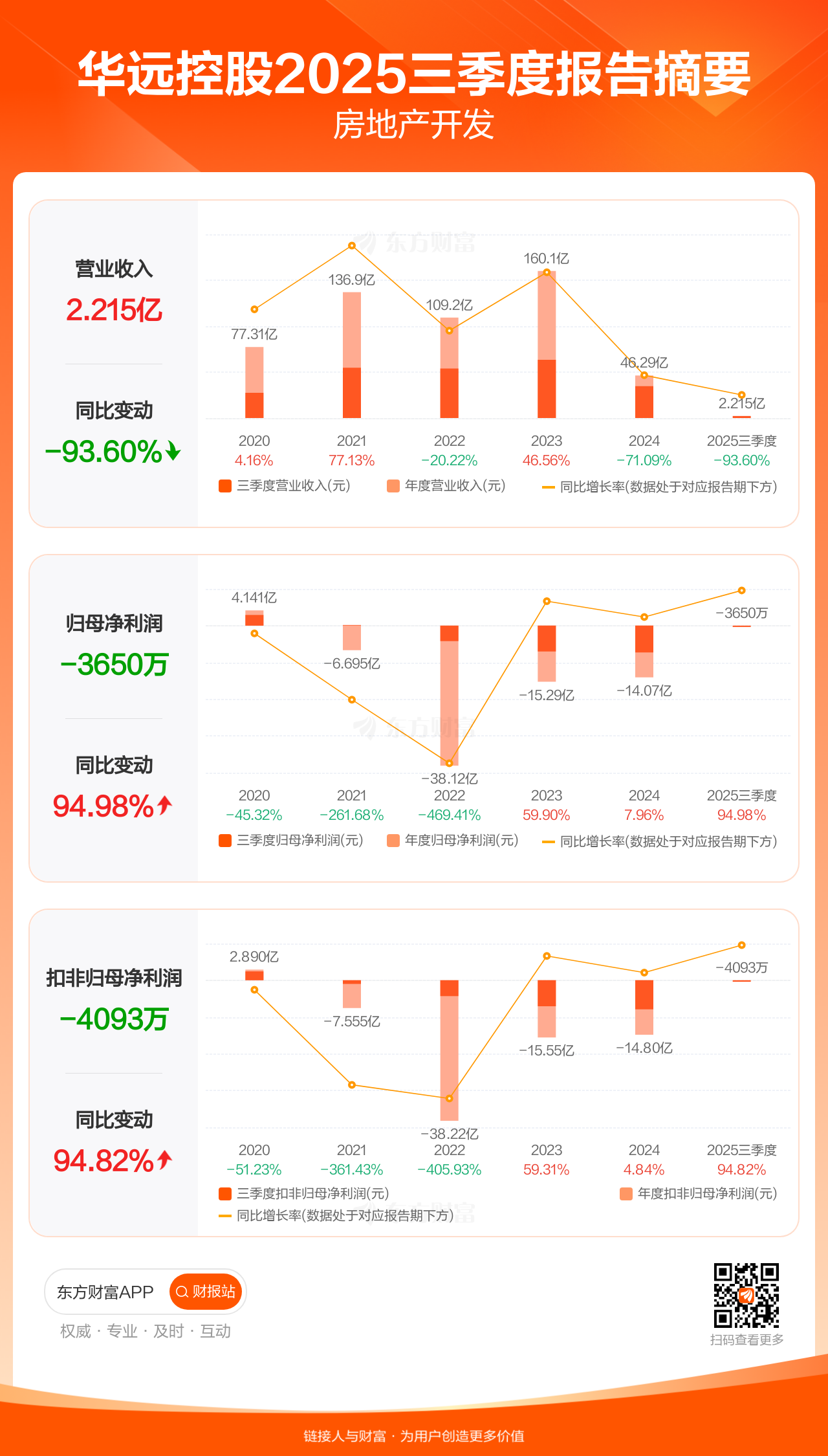 华远控股10月30日发布2025年三季报显示,公司前三季实现营业收入2.21亿元,同比下滑93.60%;归母净利润-3650.12万元;扣非归母净利润-4092.60万元。