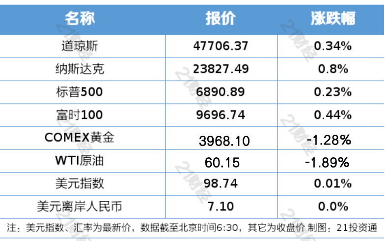 1、美股三大指数集体收涨,续创新高。纳指涨0.8%,道指涨0.34%,标普500指数涨0.23%。英伟达涨约5%,续创新高,总市值逼近5万亿美元。微软涨约2%,总市值重新站上4万亿美元。纳斯达克中国金龙指数收跌1.23%。欧洲主要股指收盘涨跌不一,英国富时100指数收涨0.52%,续创新高。COMEX黄金期货跌1.28%,报3968.10美元/盎司;COMEX白银期货涨0.78%,报47.14美元/盎司。