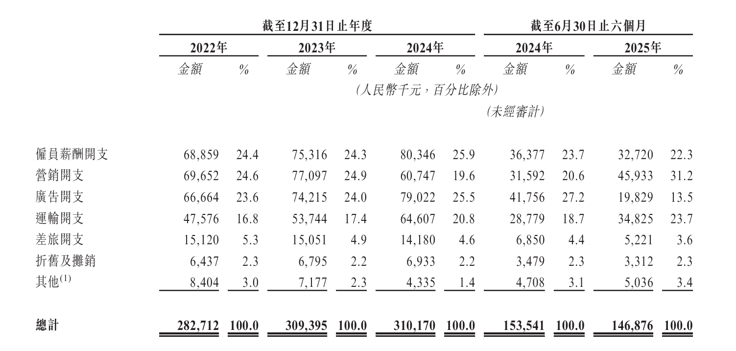 另需注意的是,溜溜果园2022年至2024年销售及经销开支居高不下,分别约为2.83亿元、3.09亿元、3.1亿元,其中广告开支分别为6666.4万元、7421.5万元、7902.2万元。2025年上半年,该公司广告开支同比有所下滑,为1982.9万元。