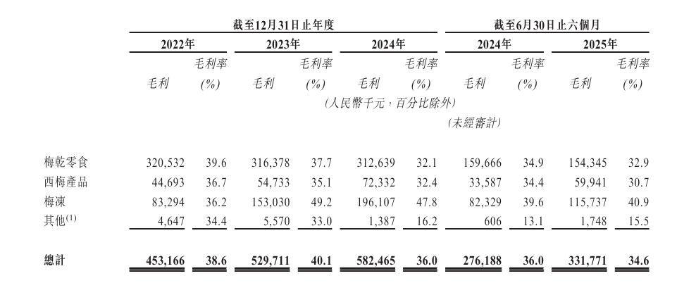 尽管业绩稳健增长,溜溜果园主力产品梅干零食毛利率却持续走低,2022年至2024年分别为39.6%、37.7%、32.1%。2025年上半年,该公司梅干零食毛利率为32.9%,同比亦有所下滑。