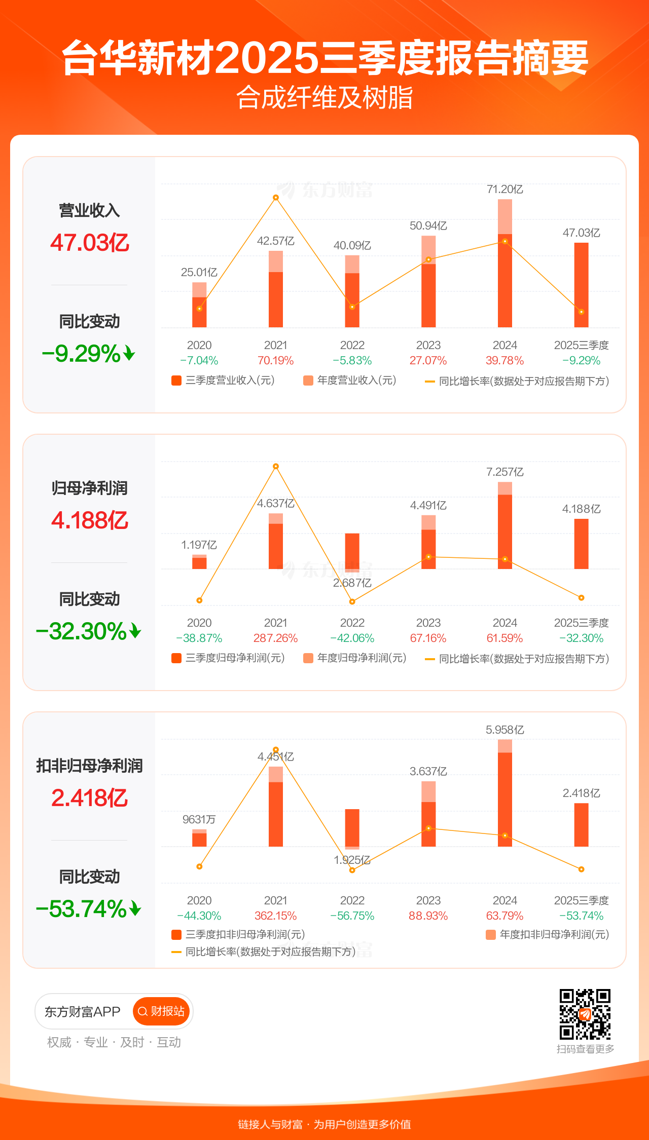 台华新材10月30日发布2025年三季报显示,公司前三季实现营业收入47.03亿元,同比下滑9.29%;归母净利润4.19亿元,同比下滑32.30%;扣非归母净利润2.42亿元,同比下滑53.74%。