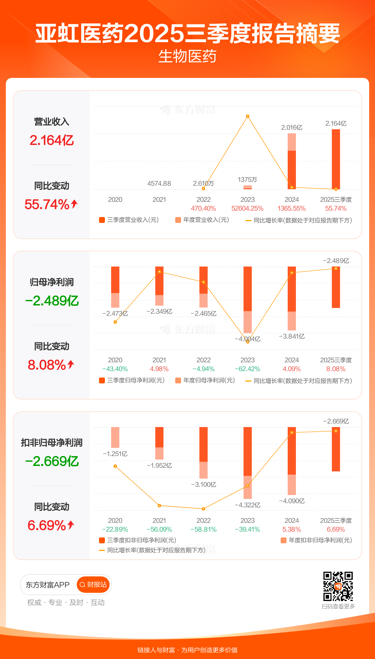 亚虹医药10月30日发布2025年三季报显示,公司前三季实现营业收入2.16亿元,同比增长55.74%;归母净利润-2.49亿元;扣非归母净利润-2.67亿元。