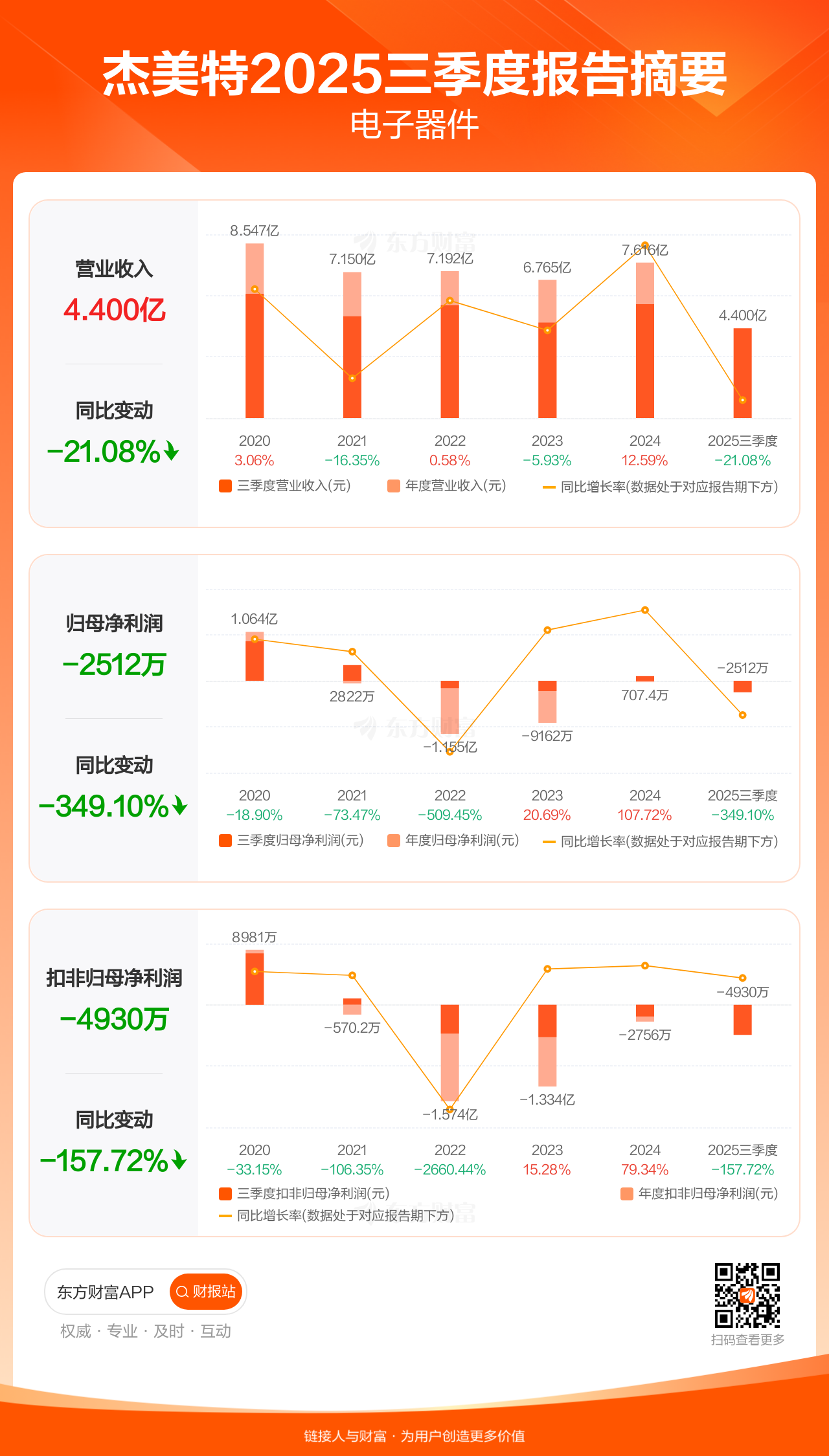 杰美特10月30日发布2025年三季报显示,公司前三季实现营业收入4.40亿元,同比下滑21.08%;归母净利润-2512.13万元;扣非归母净利润-4930.32万元。