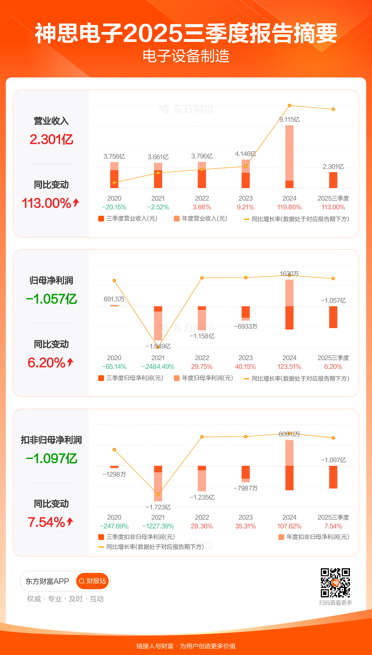 神思电子10月30日发布2025年三季报显示,公司前三季实现营业收入2.30亿元,同比增长113.00%;归母净利润-1.06亿元;扣非归母净利润-1.10亿元。