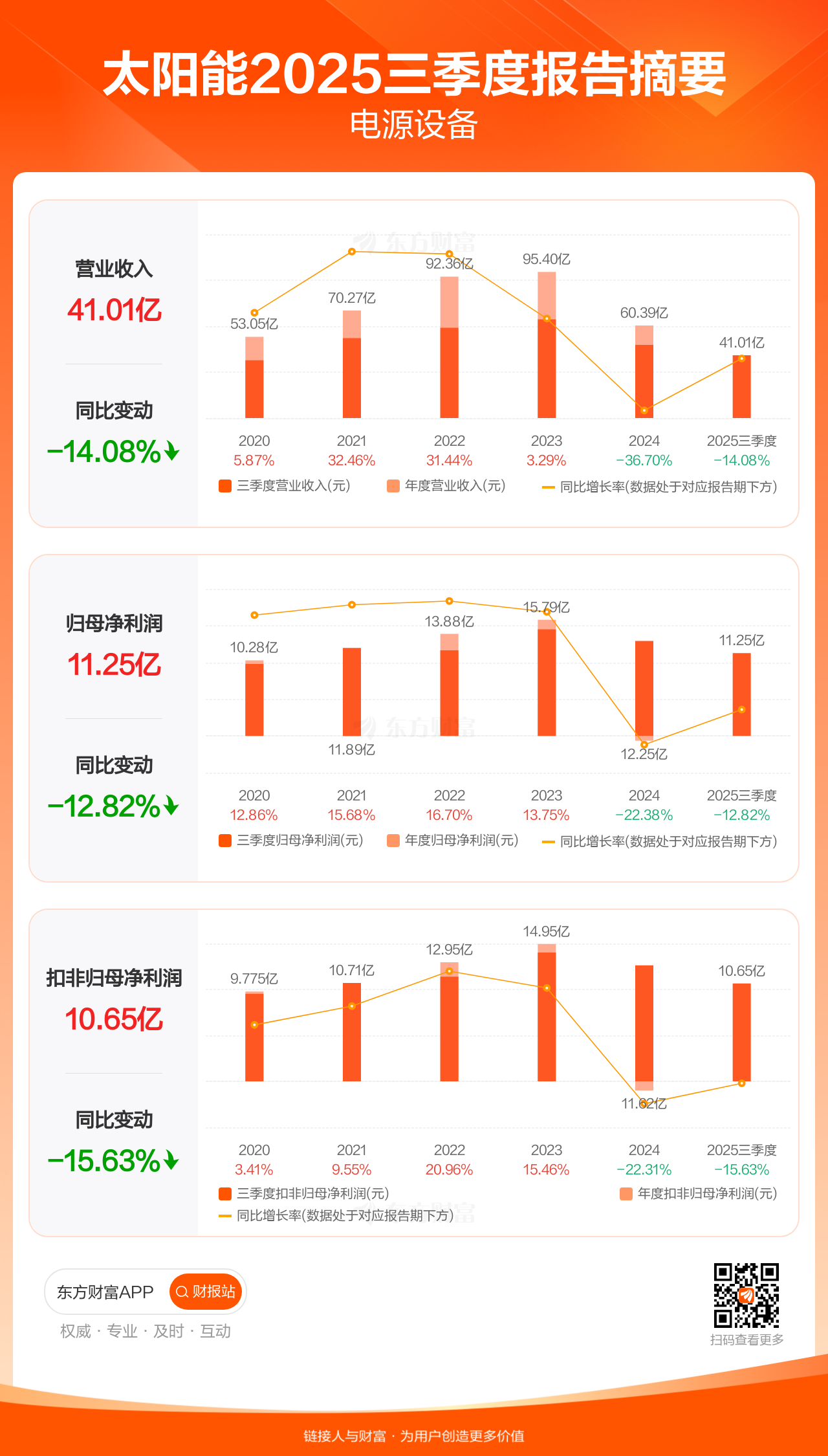 太阳能10月30日发布2025年三季报显示,公司前三季实现营业收入41.01亿元,同比下滑14.08%;归母净利润11.25亿元,同比下滑12.82%;扣非归母净利润10.65亿元,同比下滑15.63%。