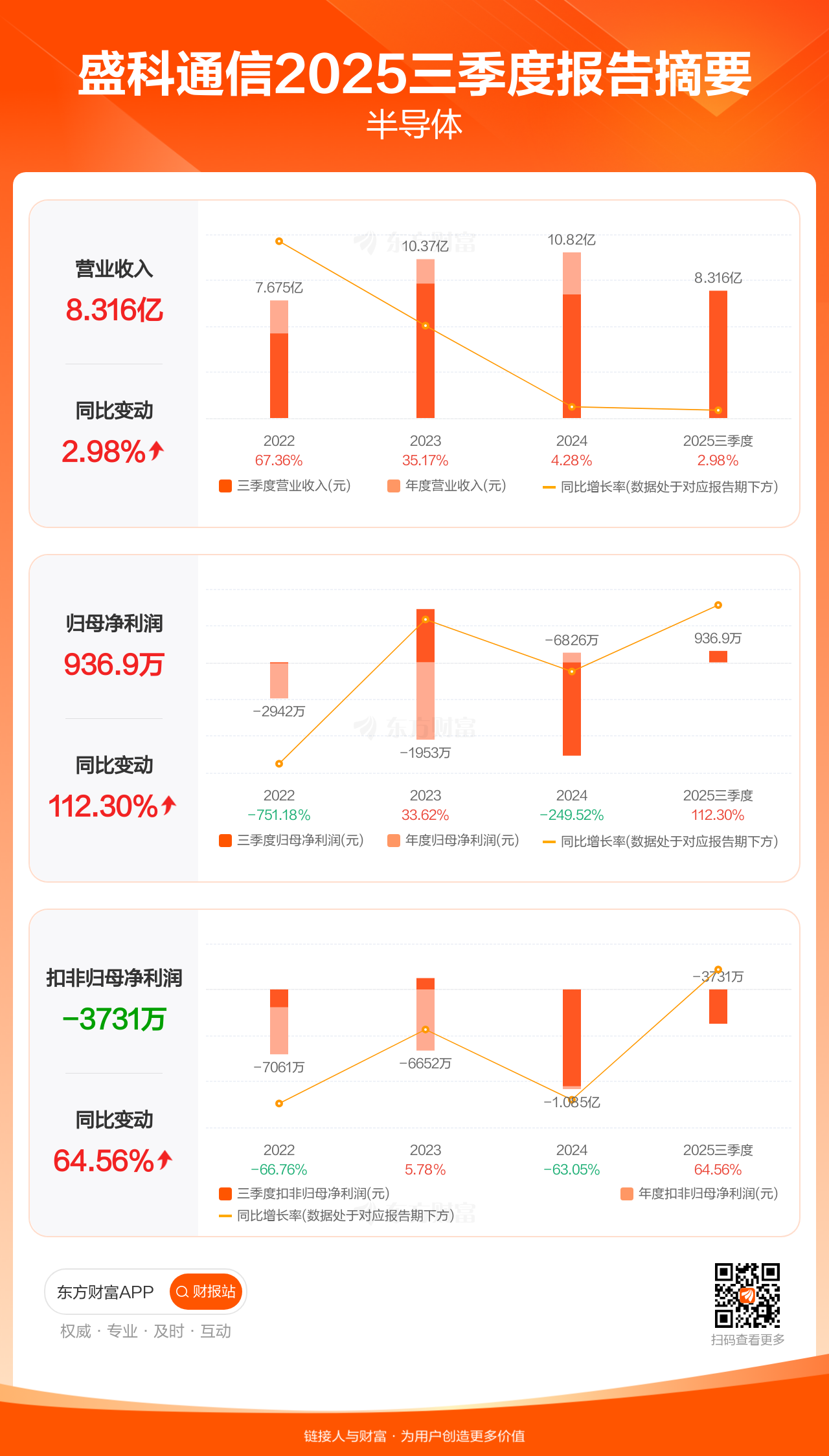 盛科通信10月30日发布2025年三季报显示,公司前三季实现营业收入8.32亿元,同比增长2.98%;归母净利润936.92万元,同比增长112.30%;扣非归母净利润-3731.29万元。