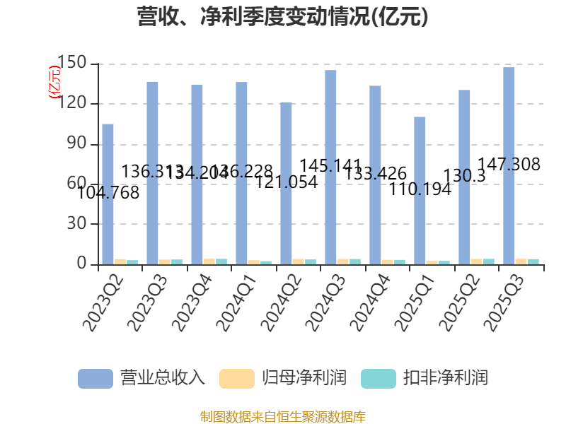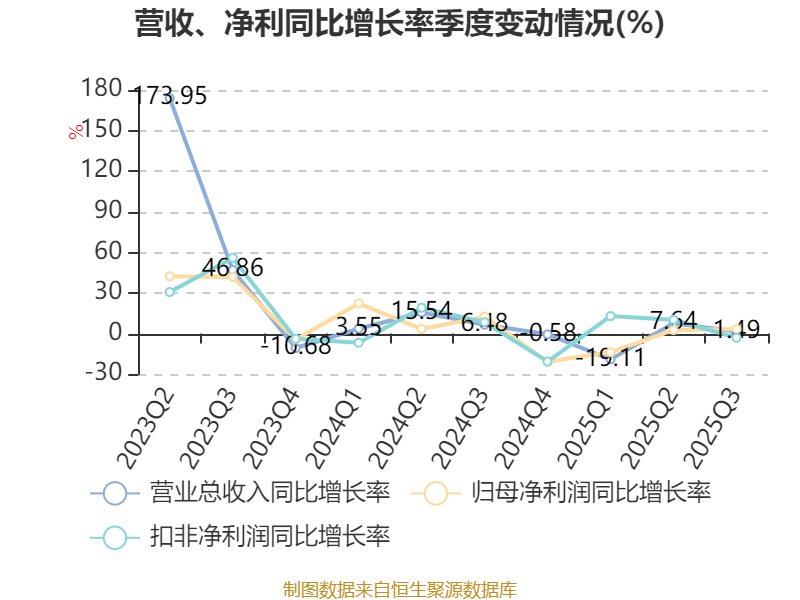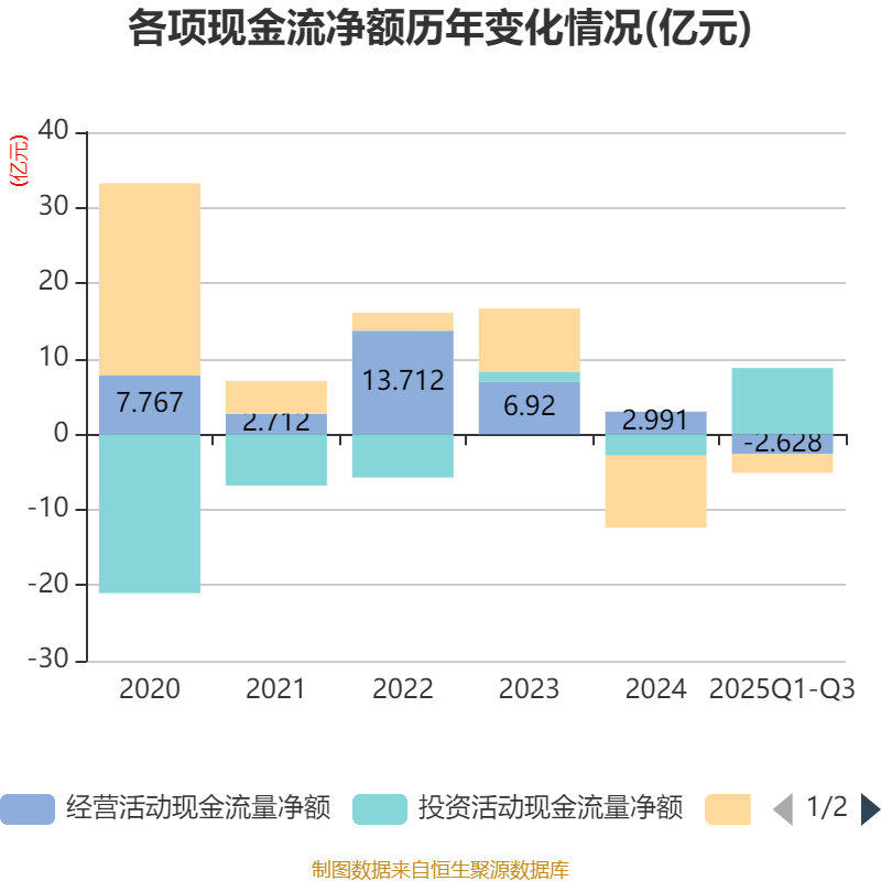 2025年前三季度,公司经营活动现金流净额为-2.63亿元,同比增加7556.04万元;筹资活动现金流净额-2.49亿元,同比增加5.86亿元;投资活动现金流净额8.77亿元,上年同期为-1.14亿元。