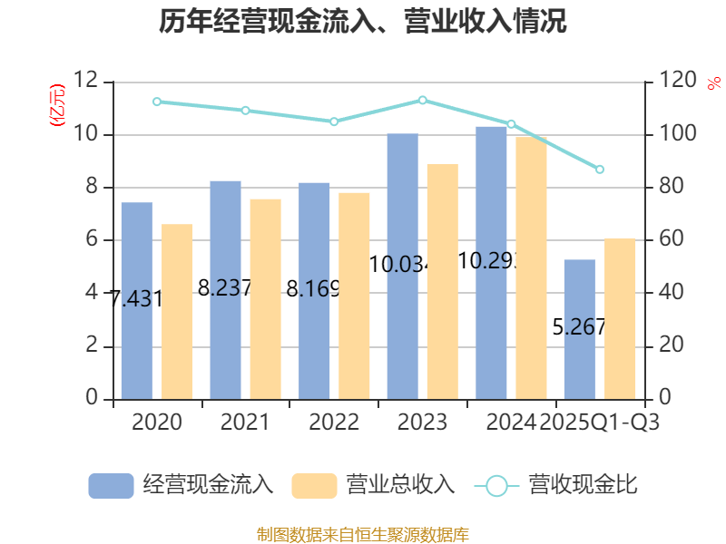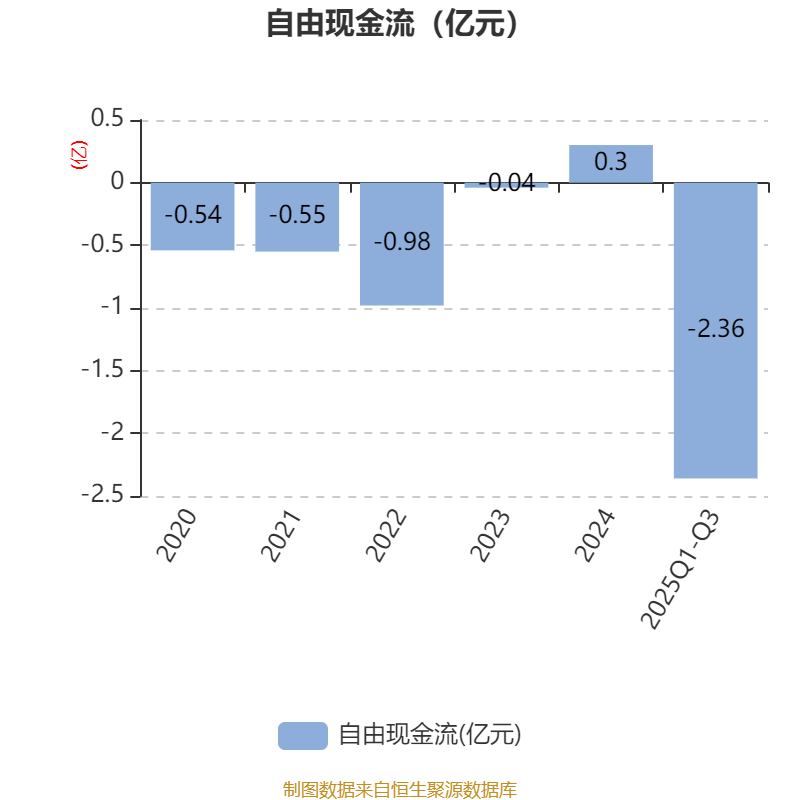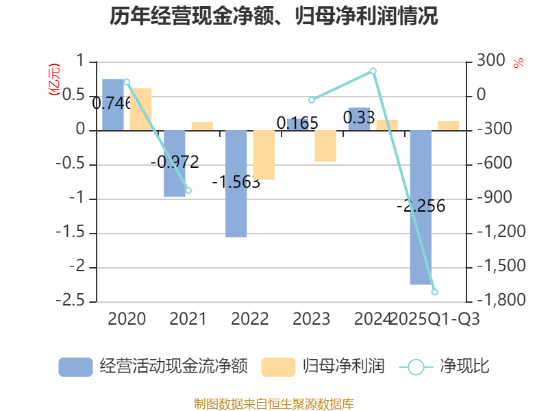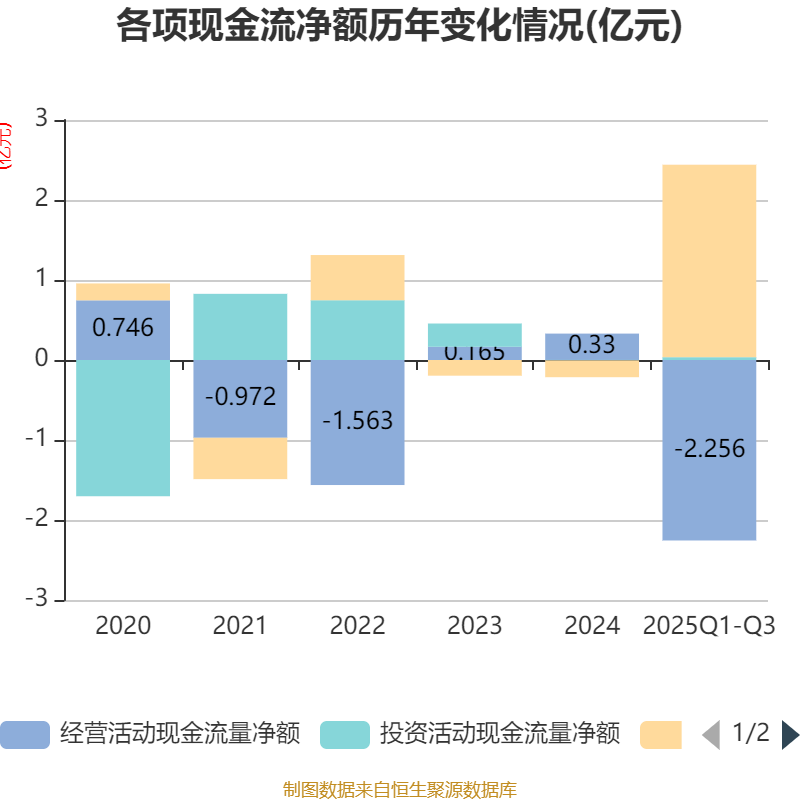 2025年前三季度,公司经营活动现金流净额为-2.26亿元,同比减少579.61万元;筹资活动现金流净额2.41亿元,同比增加849.38万元;投资活动现金流净额346.65万元,上年同期为-3613.72万元。