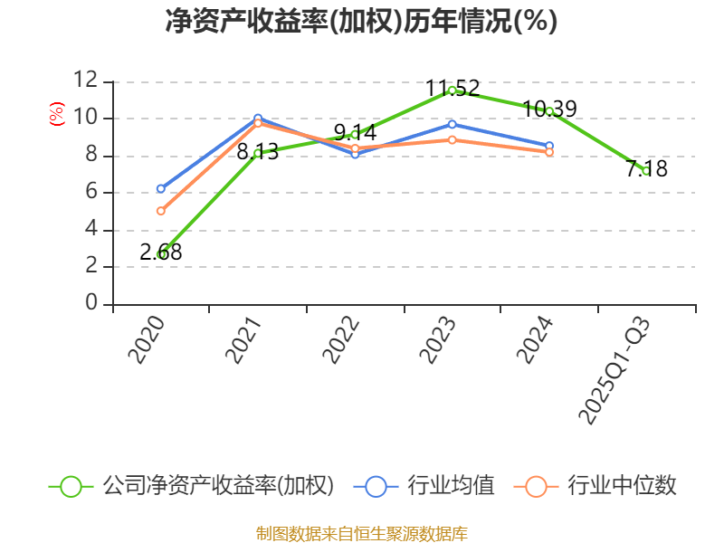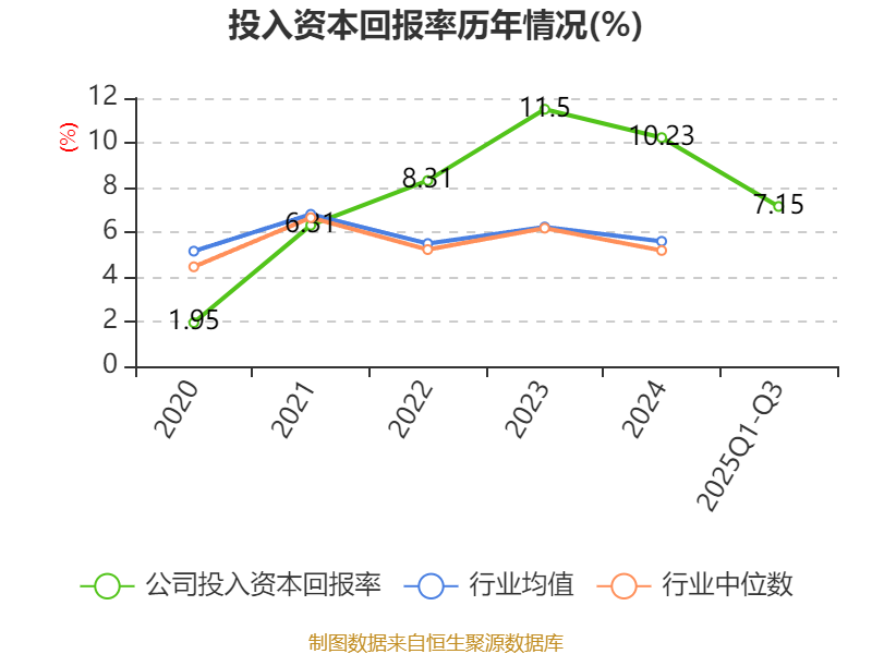 盈利能力方面, 2025年前三季度公司加权平均净资产收益率为7.18%,同比下降0.41个百分点。公司2025年前三季度投入资本回报率为7.15%,较上年同期下降0.42个百分点。