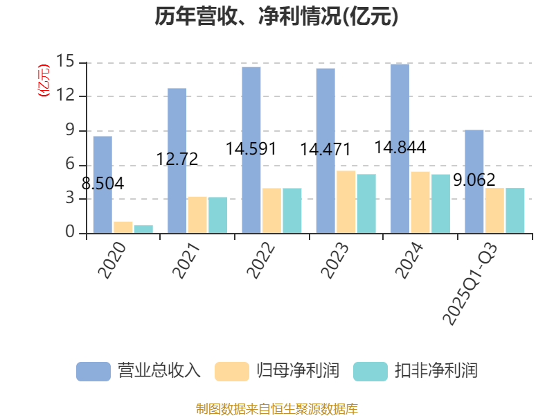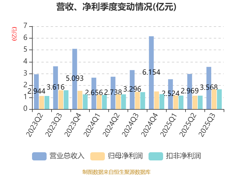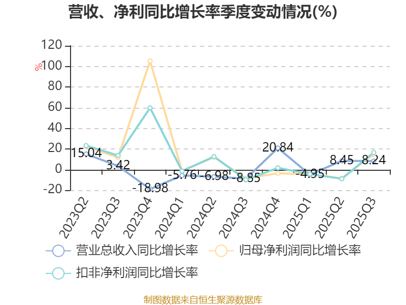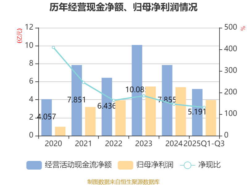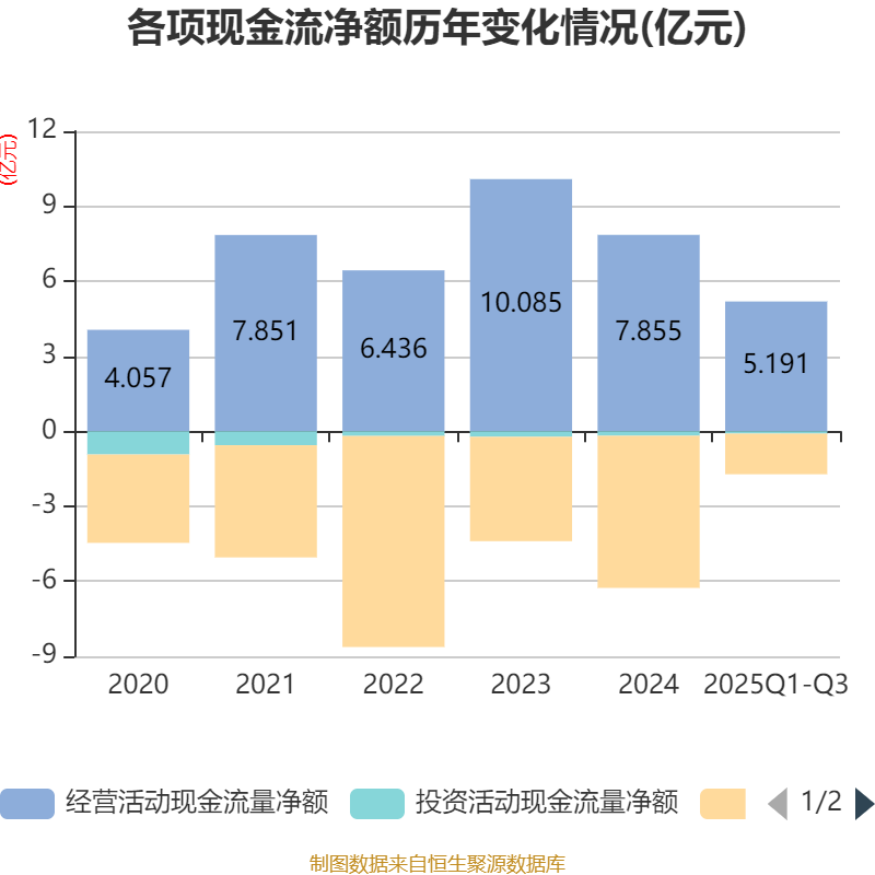 2025年前三季度,公司经营活动现金流净额为5.19亿元,同比增长4.86%;筹资活动现金流净额-1.63亿元,同比增加1440.63万元;投资活动现金流净额-952.36万元,上年同期为-1037.08万元。