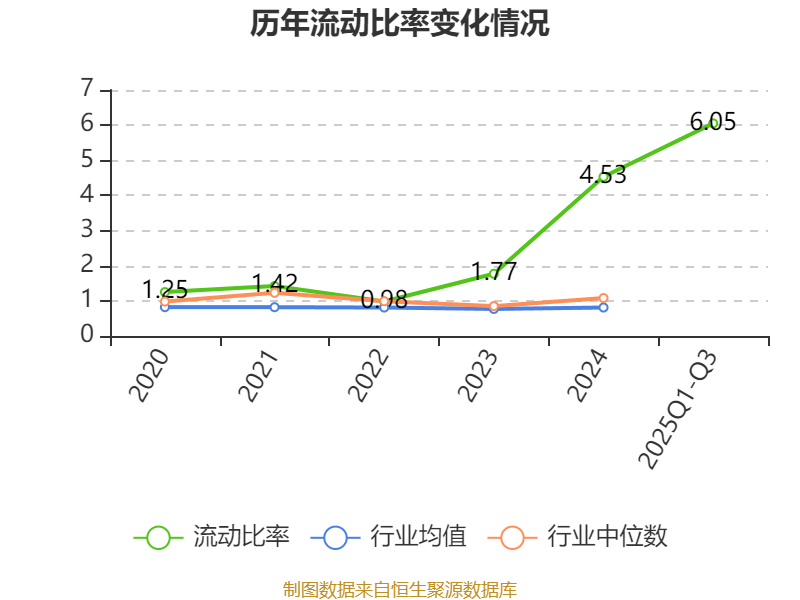 2025年前三季度,公司流动比率为6.05,速动比率为5.66。