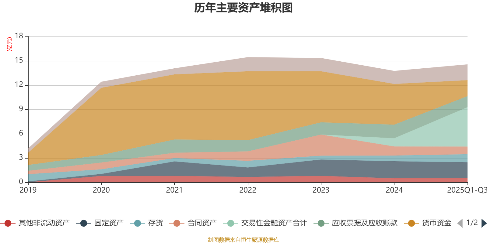 资产重大变化方面,截至2025年三季度末,公司交易性金融资产合计较上年末增加383.79%,占公司总资产比重上升26.11个百分点;货币资金较上年末减少60.77%,占公司总资产比重下降23.02个百分点;应收票据及应收账款较上年末减少18.88%,占公司总资产比重下降2.87个百分点;合同资产较上年末减少16.43%,占公司总资产比重下降1.73个百分点。