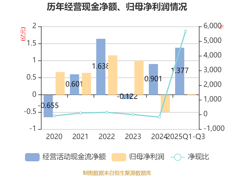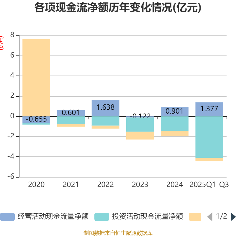 2025年前三季度,公司经营活动现金流净额为1.38亿元,同比增加1.51亿元;筹资活动现金流净额-3249.78万元,同比增加944.85万元;投资活动现金流净额-4.12亿元,上年同期为-3.7亿元。