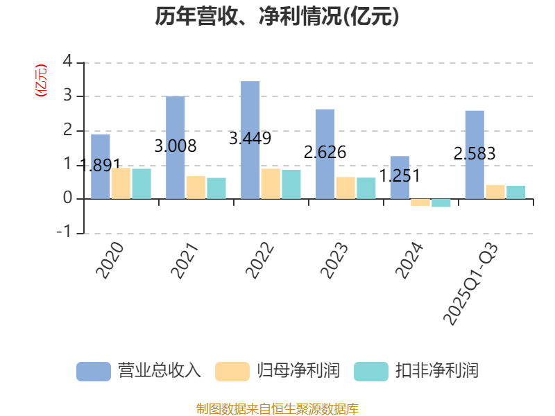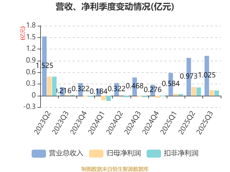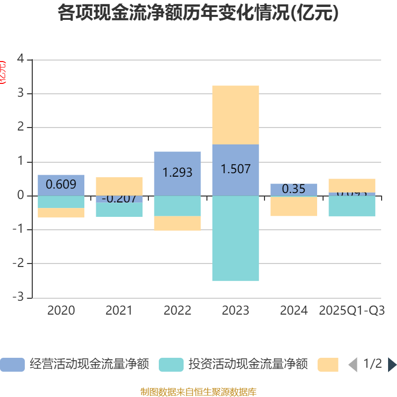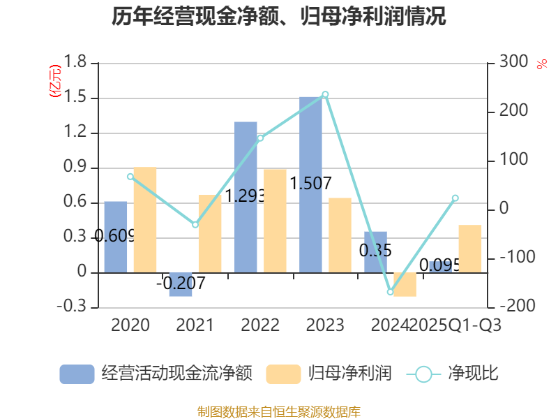 2025年前三季度,公司经营活动现金流净额为954.03万元,同比下降76.68%;筹资活动现金流净额4001.08万元,同比增加9593.81万元;投资活动现金流净额-6069.34万元,上年同期为363万元。