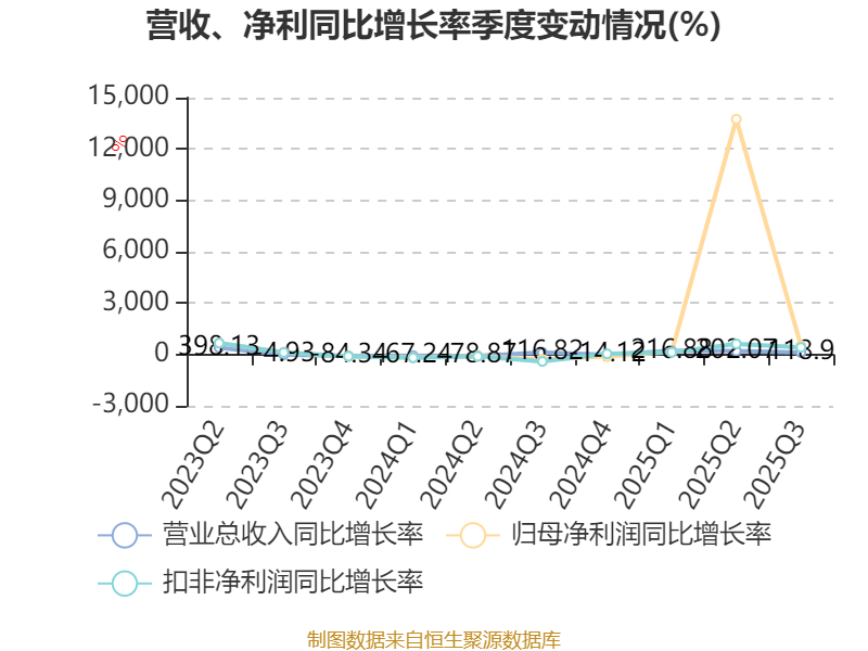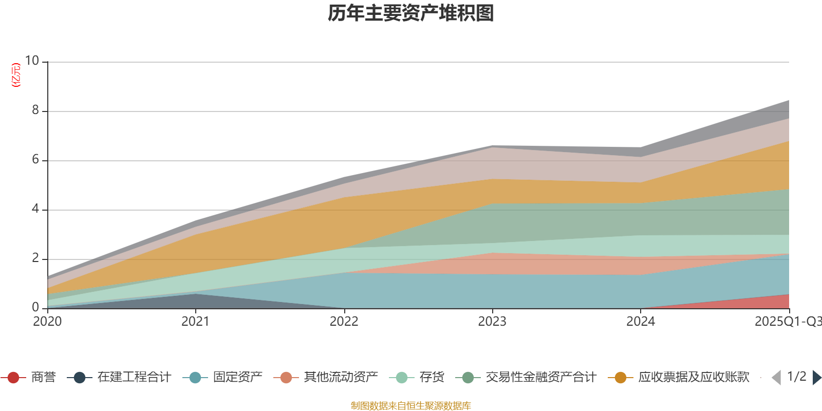 资产重大变化方面,截至2025年三季度末,公司其他流动资产较上年末减少96.87%,占公司总资产比重下降10.91个百分点;应收票据及应收账款较上年末增加133.26%,占公司总资产比重上升10.3个百分点;商誉占公司总资产的6.63%,上年末为0;货币资金较上年末减少10.96%,占公司总资产比重下降4.93个百分点。