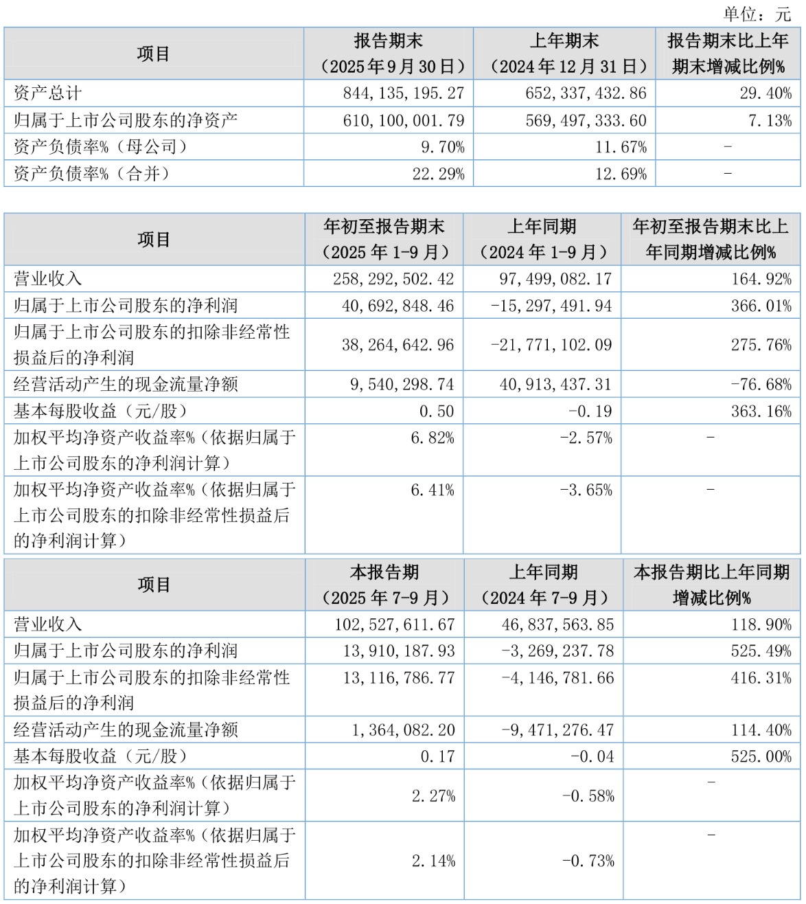 中证智能财讯卓兆点胶(920026)10月29日披露2025年第三季度报告。前三季度公司实现营业总收入2.58亿元,同比增长164.92%;归母净利润4069.28万元,同比扭亏;扣非净利润3826.46万元,同比扭亏;经营活动产生的现金流量净额为954.03万元,同比下降76.68%;报告期内,卓兆点胶基本每股收益为0.5元,加权平均净资产收益率为6.82%。