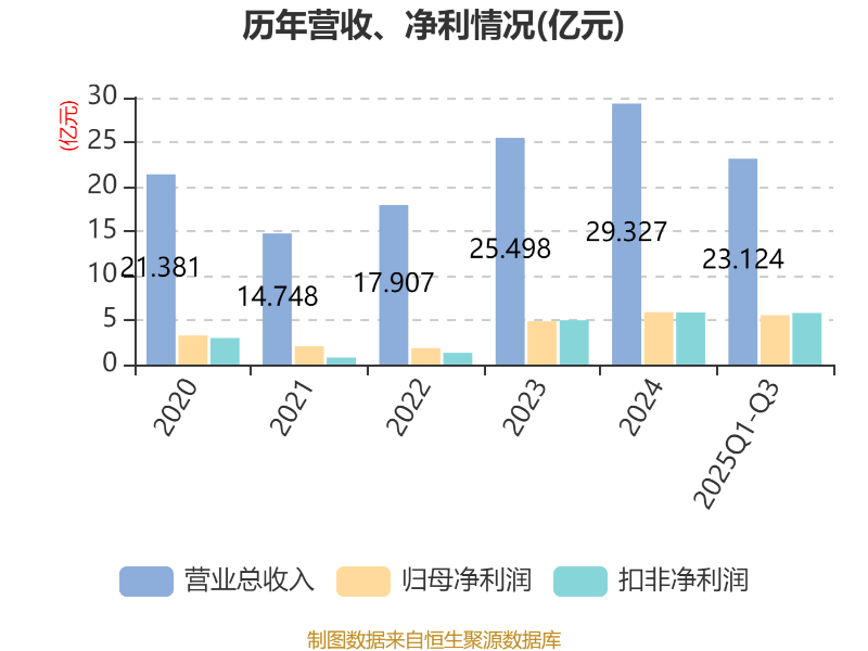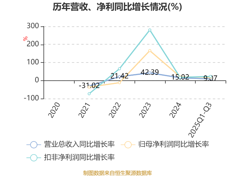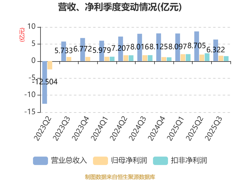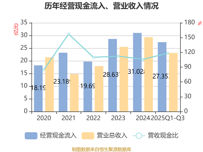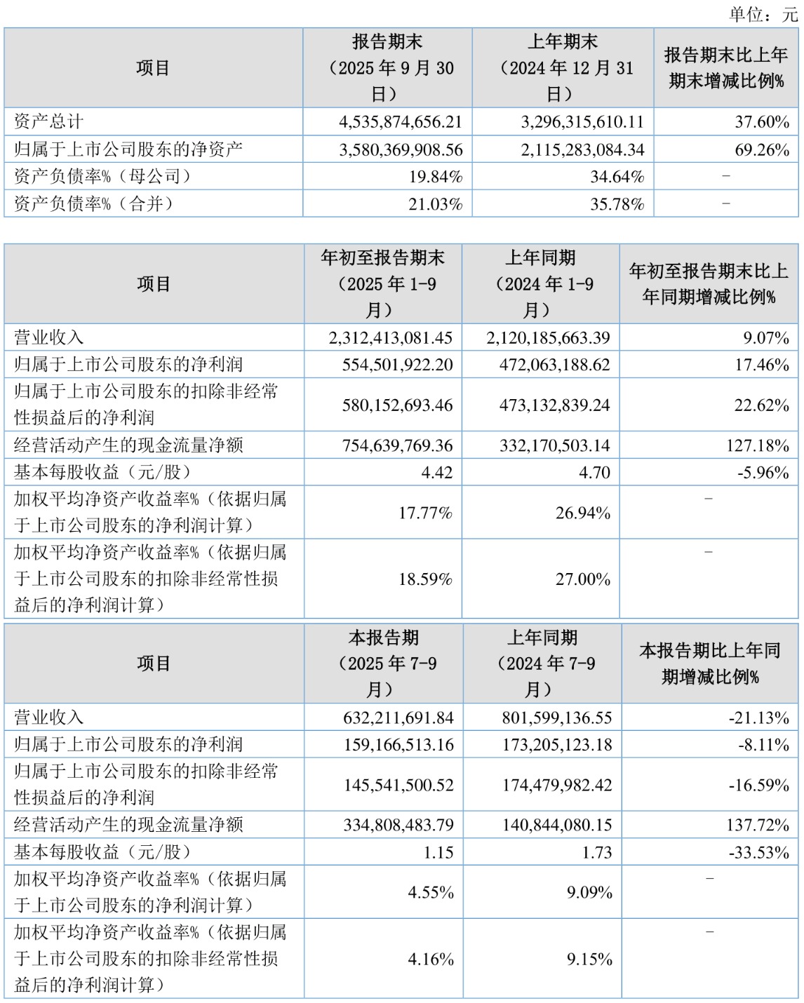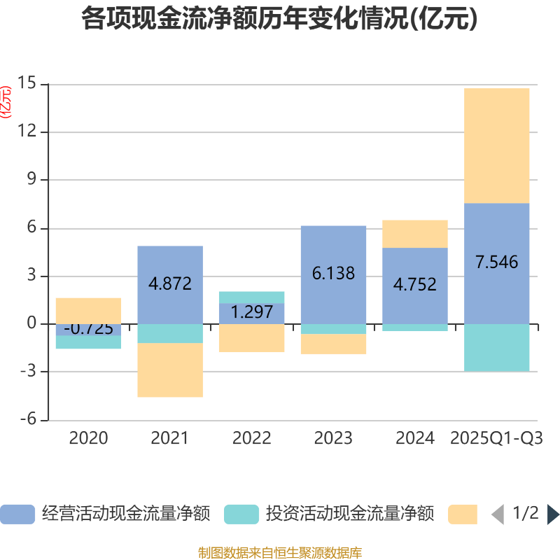 2025年前三季度,公司经营活动现金流净额为7.55亿元,同比增长127.18%;筹资活动现金流净额7.18亿元,同比增加7.22亿元;投资活动现金流净额-2.96亿元,上年同期为-2.04亿元。