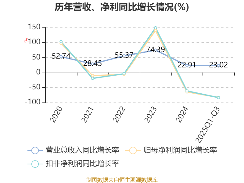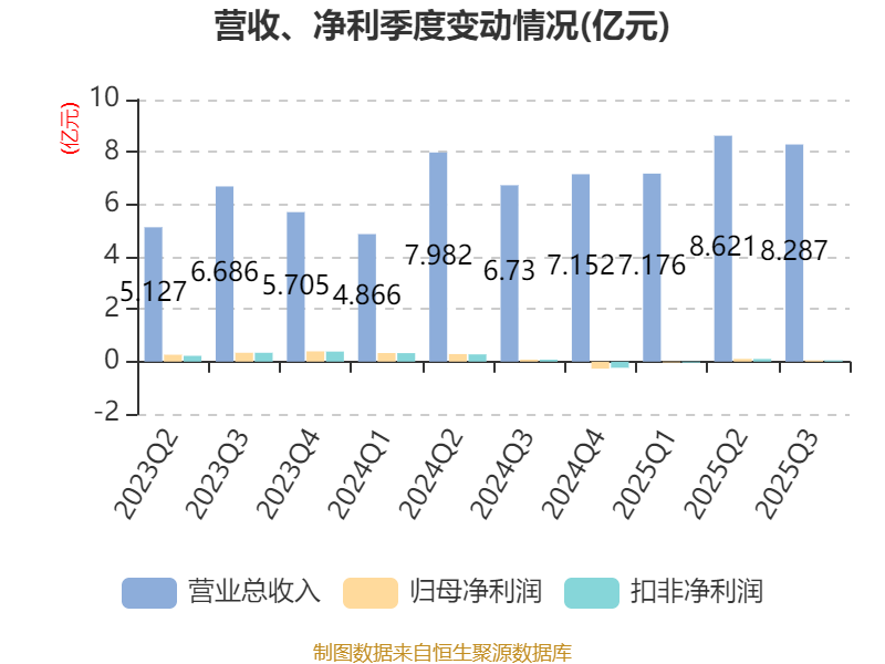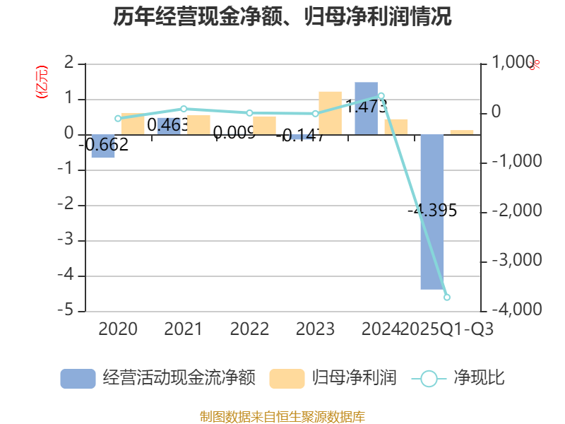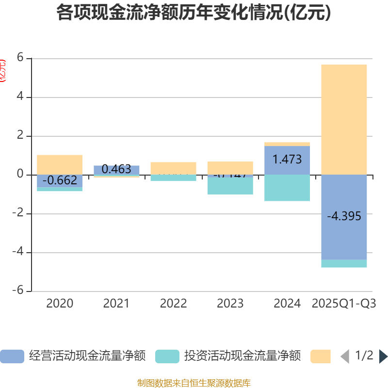 2025年前三季度,公司经营活动现金流净额为-4.4亿元,同比减少6.73亿元;筹资活动现金流净额5.67亿元,同比增加7.22亿元;投资活动现金流净额-3925.43万元,上年同期为-7224.04万元。