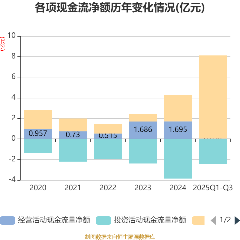 2025年前三季度,公司经营活动现金流净额为339.95万元,同比下降90.06%;筹资活动现金流净额8.08亿元,同比增加6.12亿元;投资活动现金流净额-2.44亿元,上年同期为-2.57亿元。