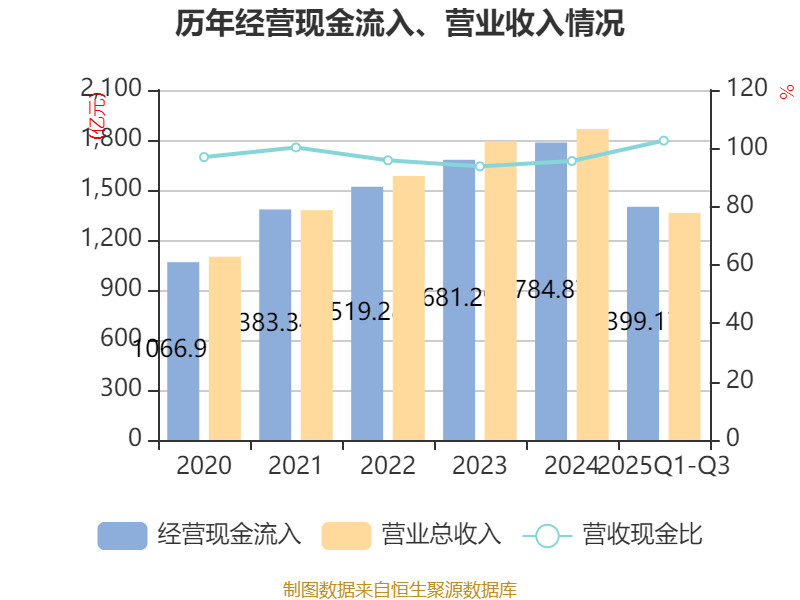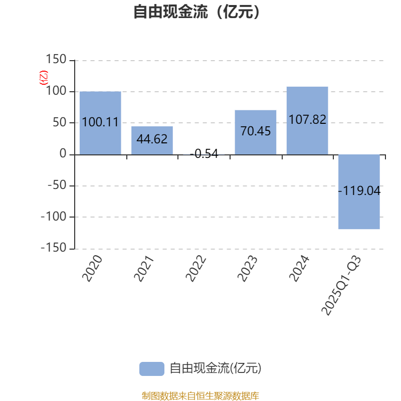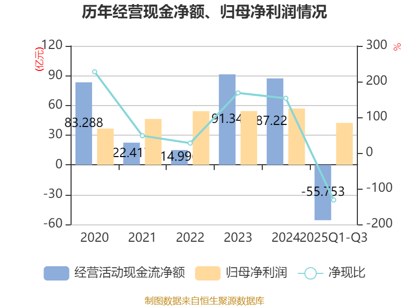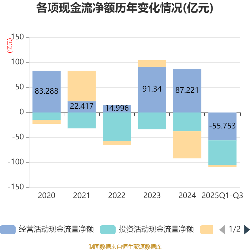 2025年前三季度,公司经营活动现金流净额为-55.75亿元,同比增加5649.02万元;筹资活动现金流净额-4.49亿元,同比增加22.94亿元;投资活动现金流净额-49.04亿元,上年同期为-12.5亿元。