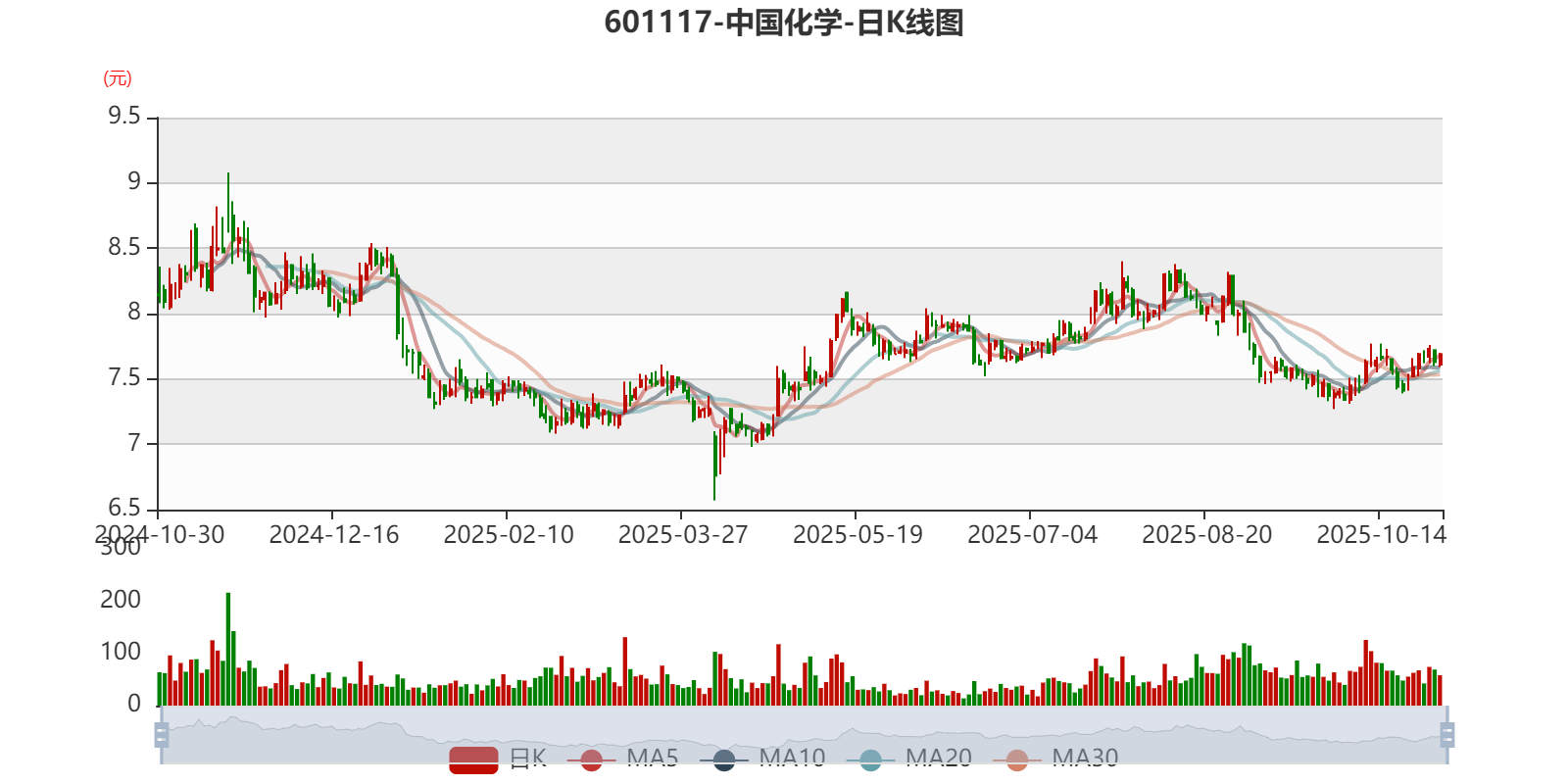以10月29日收盘价计算,中国化学目前市盈率(TTM)约为7.72倍,市净率(LF)约0.72倍,市销率(TTM)约0.25倍。