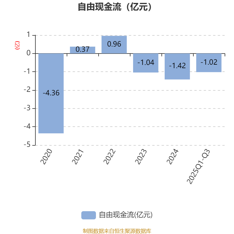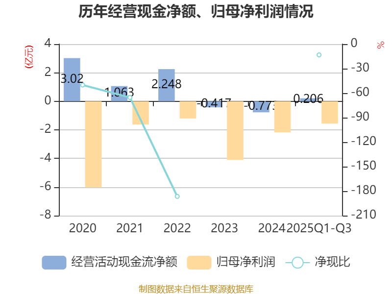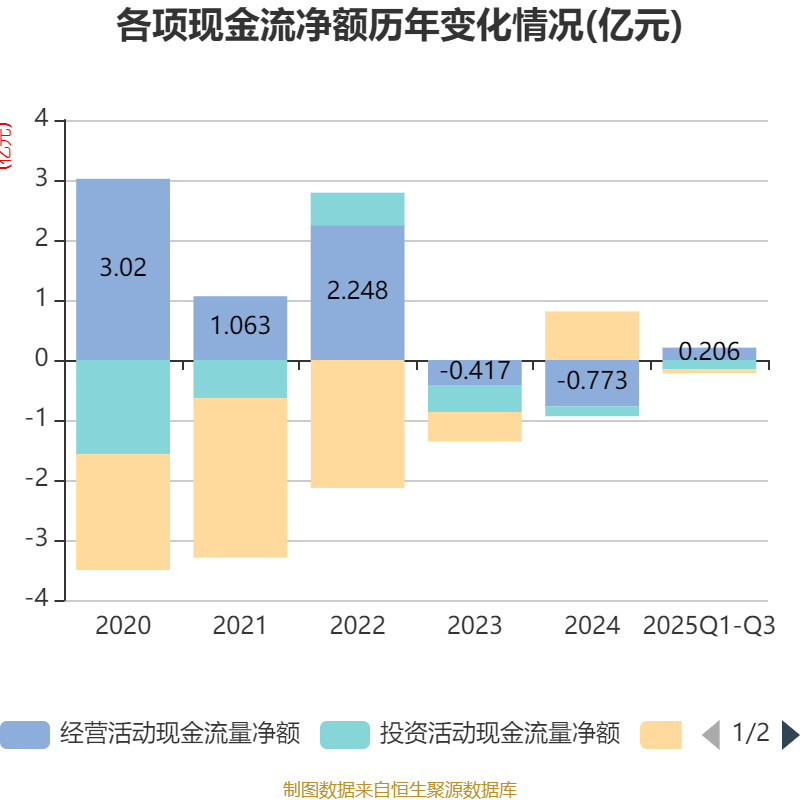 2025年前三季度,公司经营活动现金流净额为2062.96万元,同比增加3017.5万元;筹资活动现金流净额-614.95万元,同比减少2961.25万元;投资活动现金流净额-1568.32万元,上年同期为-1065.82万元。