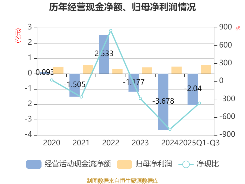 2025年前三季度,公司经营活动现金流净额为-2.04亿元,同比减少7697.2万元;筹资活动现金流净额3.33亿元,同比增加2.04亿元;投资活动现金流净额-3460.95万元,上年同期为-3075.25万元。