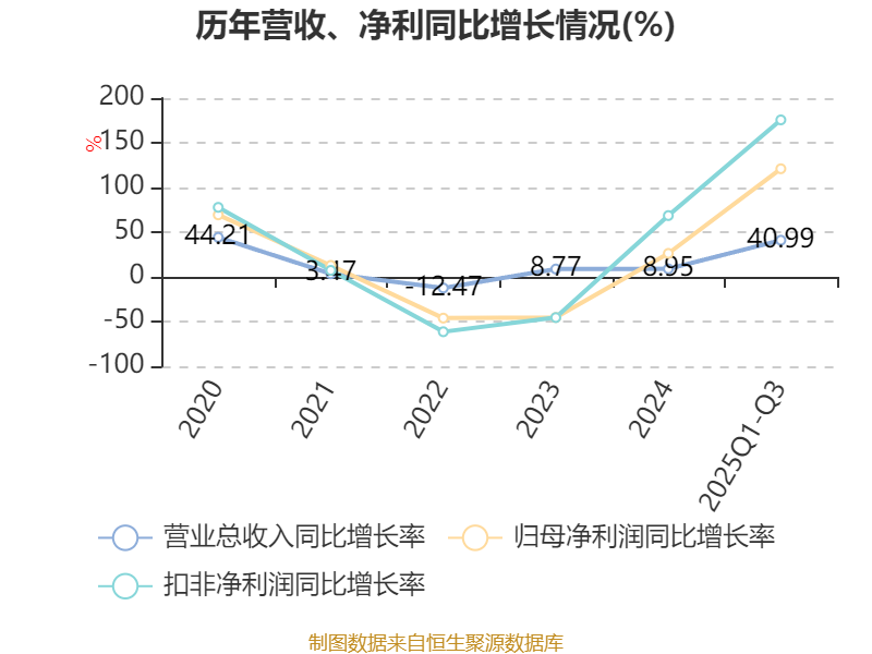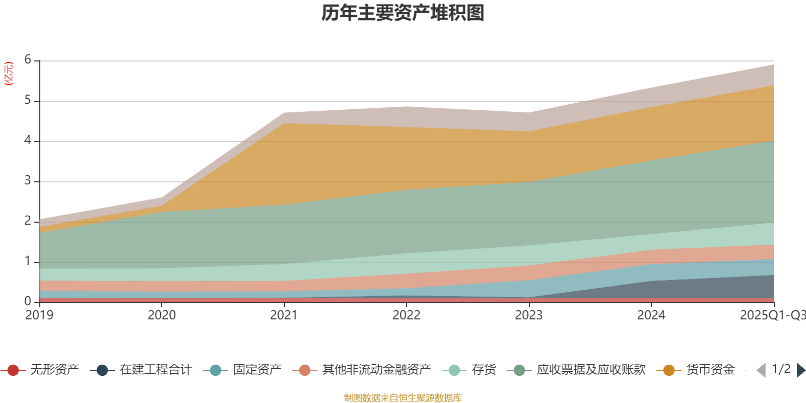 资产重大变化方面,截至2025年三季度末,公司存货较上年末增加40.78%,占公司总资产比重上升1.97个百分点;在建工程合计较上年末增加36.08%,占公司总资产比重上升1.83个百分点;货币资金较上年末增加3.34%,占公司总资产比重下降1.66个百分点;固定资产较上年末减少5.11%,占公司总资产比重下降1.12个百分点。