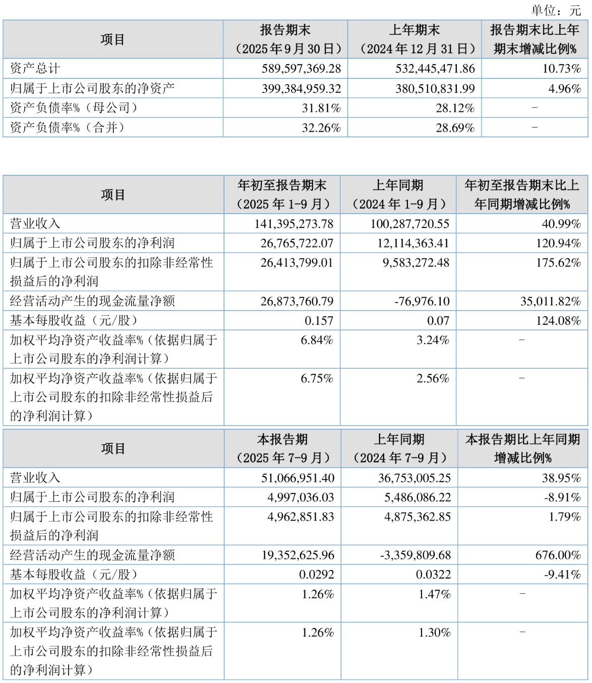 负债重大变化方面,截至2025年三季度末,公司应付票据及应付账款较上年末增加77.04%,占公司总资产比重上升5.14个百分点;短期借款较上年末增加0.01%,占公司总资产比重下降1.27个百分点;长期借款较上年末减少46.46%,占公司总资产比重下降0.97个百分点;其他应付款(含利息和股利)较上年末增加72.7%,占公司总资产比重上升0.77个百分点。