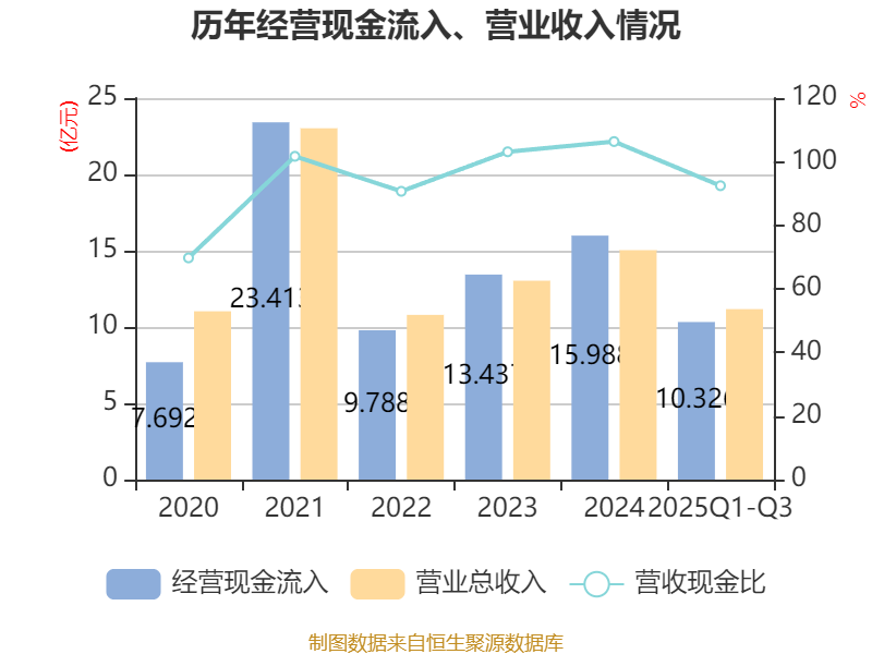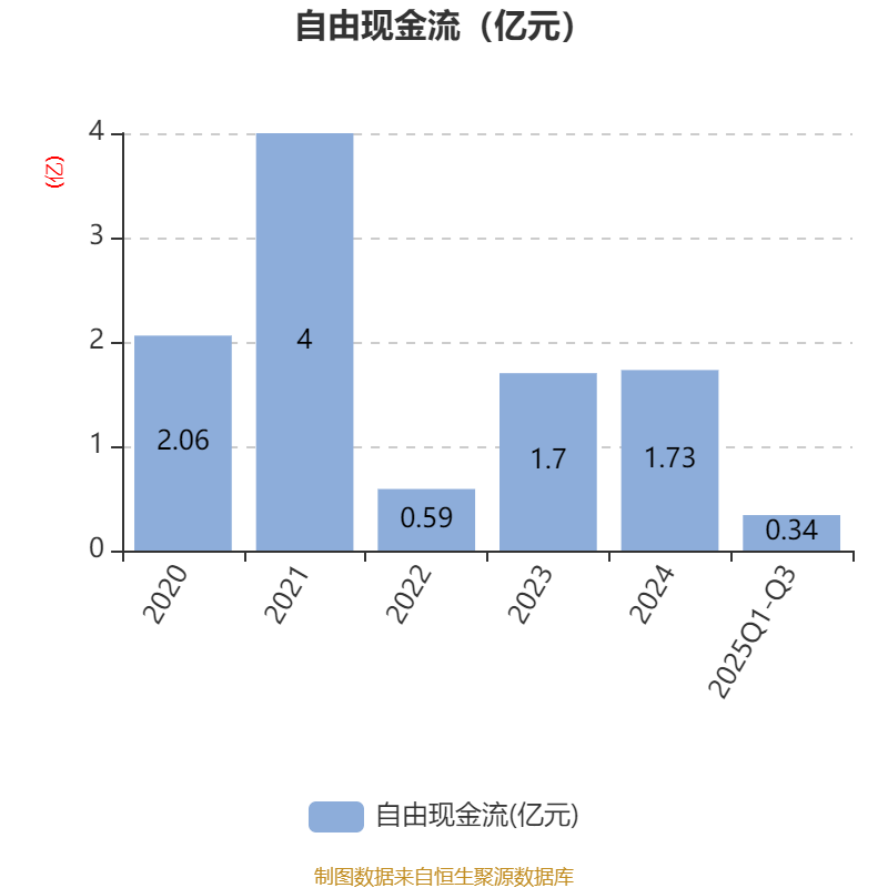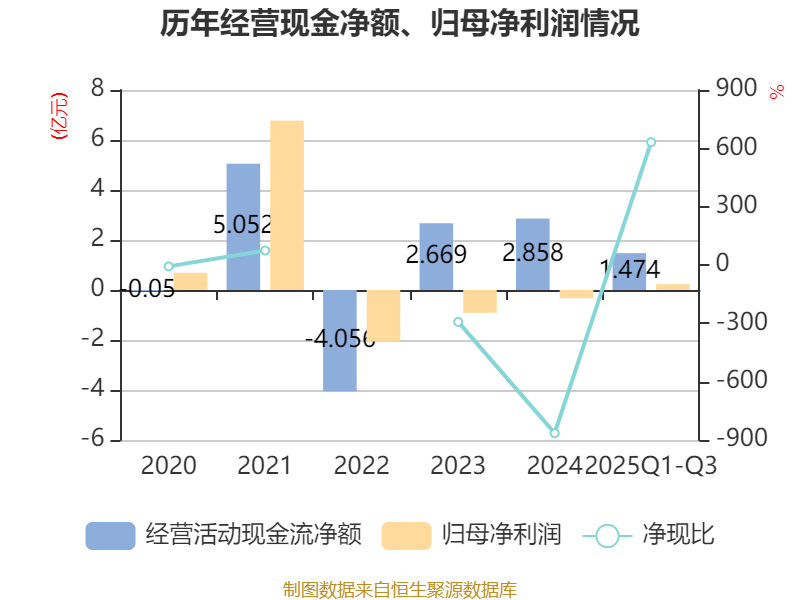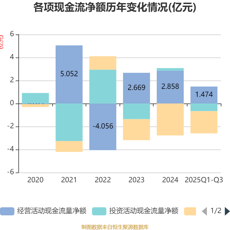 2025年前三季度,公司经营活动现金流净额为1.47亿元,同比下降43.61%;筹资活动现金流净额-1.93亿元,同比增加3884.59万元;投资活动现金流净额-6641万元,上年同期为1572.79万元。