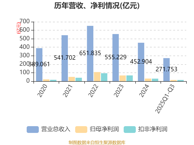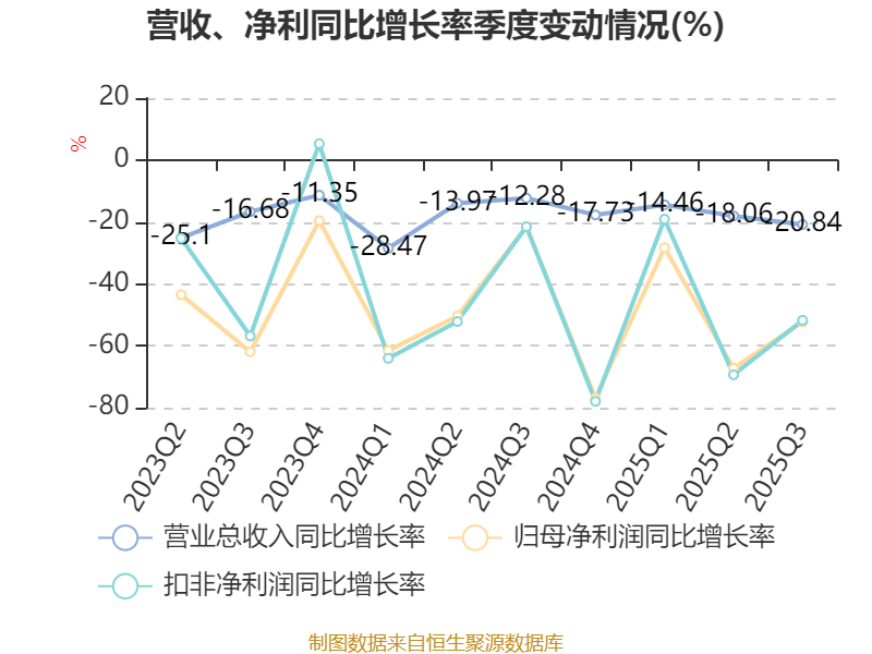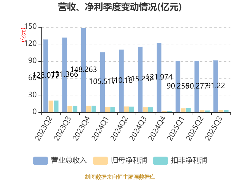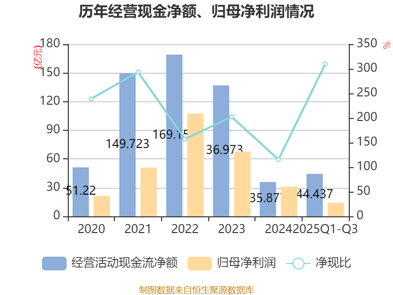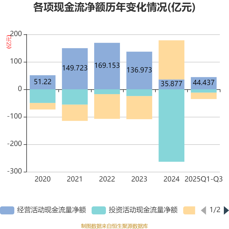 2025年前三季度,公司经营活动现金流净额为44.44亿元,同比增长72.67%;筹资活动现金流净额-23.29亿元,同比增加41.38亿元;投资活动现金流净额-12.09亿元,上年同期为-11.69亿元。