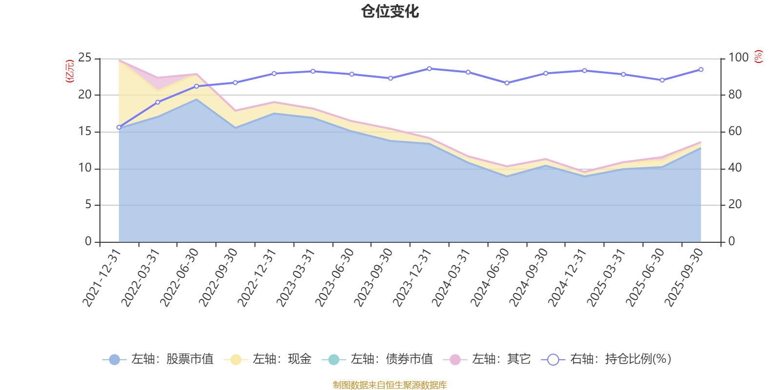据定期报告数据统计,近三年平均股票仓位为91.51%,同类平均为86.94%。2023年末基金达到94.48%的最高仓位,2021年末最低,为62.55%。
