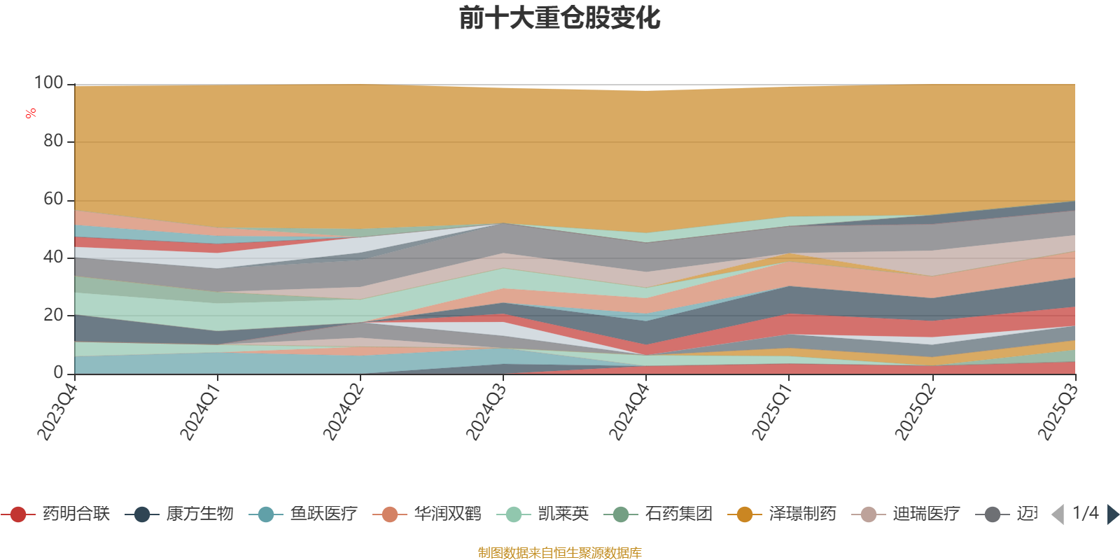 截至2025年三季度末,基金十大重仓股分别是药明康德、科伦博泰生物-B、恒瑞医药、百济神州、信达生物、三生制药、药明合联、石药集团、泽璟制药、海思科。