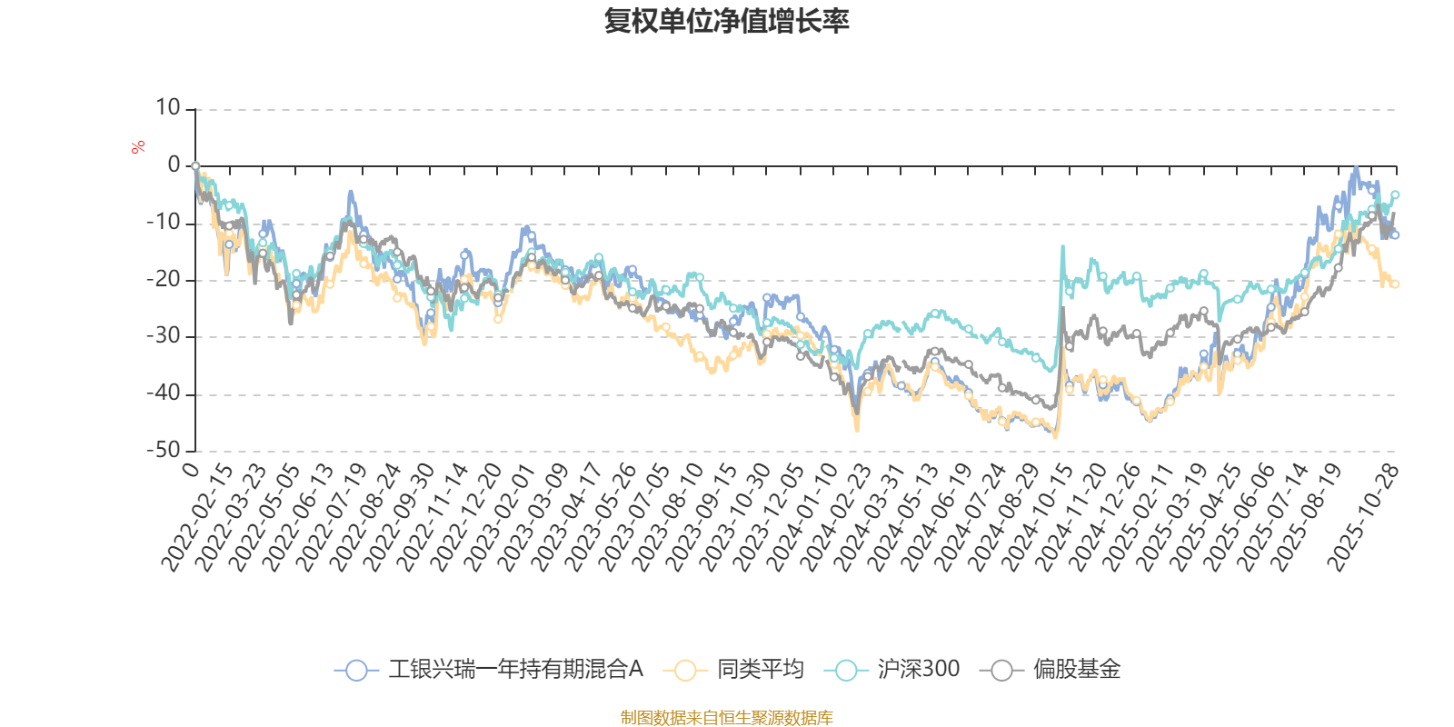 截至10月28日,工银兴瑞一年持有期混合A近三个月复权单位净值增长率为-2.08%,位于同类可比基金32/106;近半年复权单位净值增长率为31.90%,位于同类可比基金18/104;近一年复权单位净值增长率为40.18%,位于同类可比基金21/101;近三年复权单位净值增长率为11.58%,位于同类可比基金30/75。