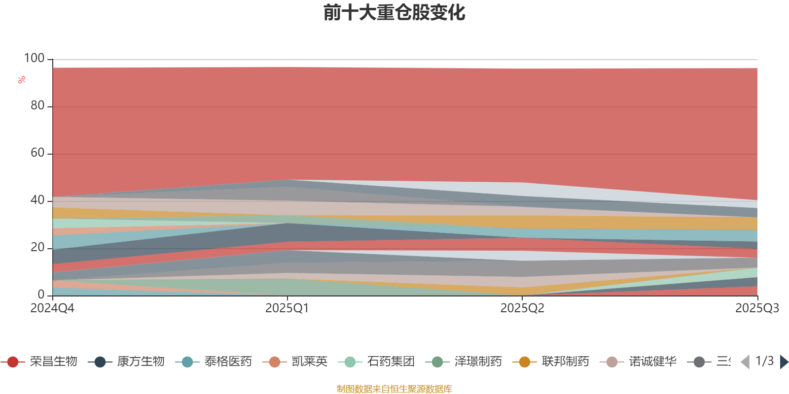截至2025年三季度末,基金十大重仓股分别是信达生物、科伦博泰生物-B、三生制药、石药集团、海思科、荣昌生物、康方生物、百济神州、先声药业、药明康德。