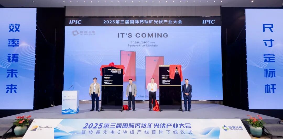 上证报中国证券网讯(记者王玉晴)10月29日,“2025第三届国际钙钛矿光伏产业大会”暨首片组件下线仪式在江苏昆山开幕。会上,协鑫光电GW级钙钛矿产线首片2400mm×1150mm全尺寸钙钛矿组件正式面世。协鑫光电方面称,这是全球钙钛矿领域尺寸最大的量产商业化产品。