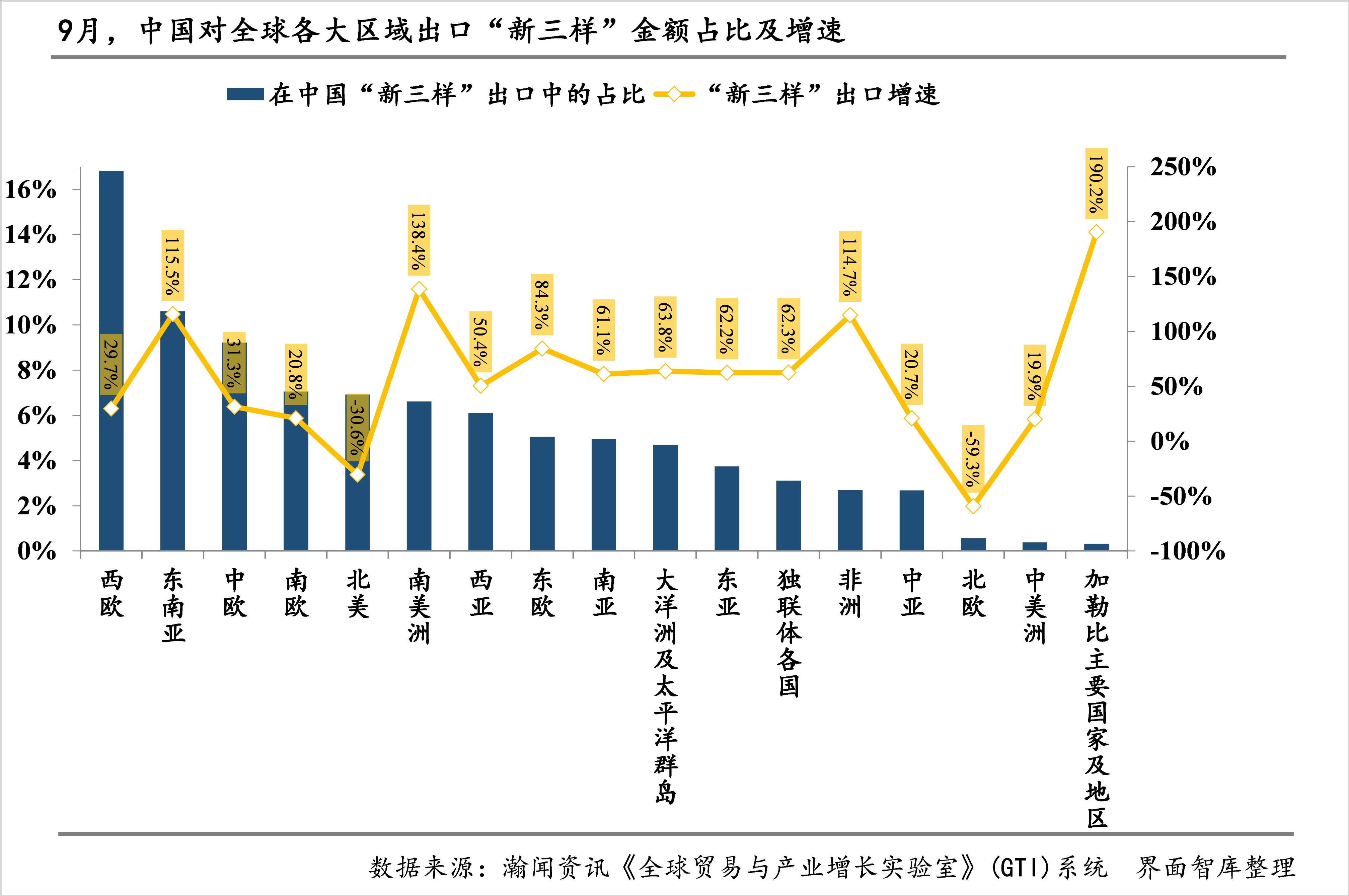 从区域来看,9月,对“新三样”增长贡献最大的区域为东南亚,当月拉动“新三样”出口增长7.9个百分点,拉动幅度为2021年3月以来新高。9月,对东南亚出口环比增长2.6%,同比增长115.5%,东南亚在“新三样”出口中的占比由此上升0.5个百分点至10.6%。当月,对西欧“新三样”出口占比为16.8%,虽较上月回落1个百分点,但仍是各主要区域中最高的。