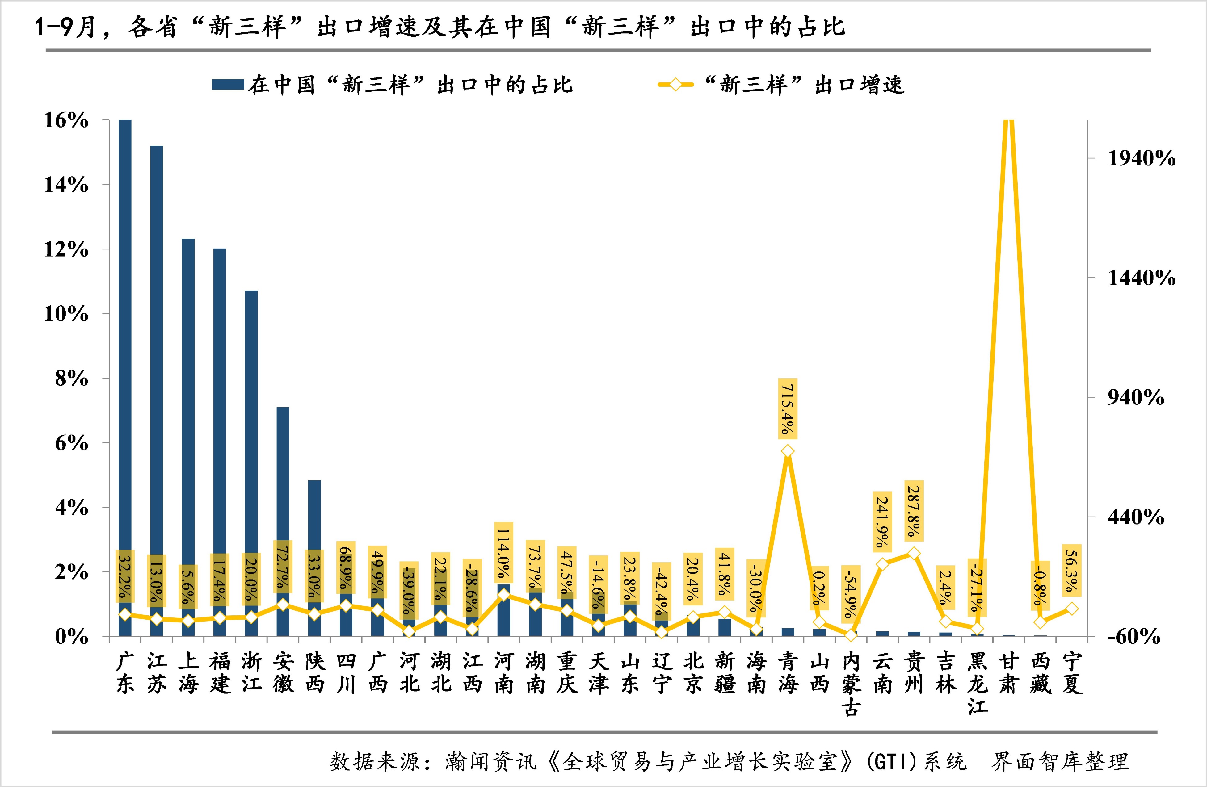 9月,在31个省市自治区中,“新三样”出口金额同比实现增长的有27个,为29个月以来最多,较上月增加了3个;当月,有20个省份同比增速较上月加快,加快的省份数量与8月持平。其中,同比增速超过100%的省份仍然有9个。
