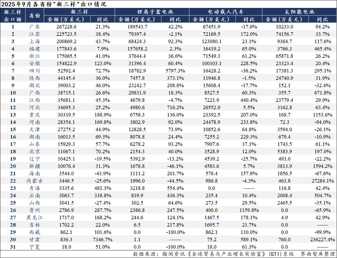 【编者按】为了更全面、更及时、更精确地反映“新三样”产品的出口状况,2025年3月起,界面新闻/界面智库和瀚闻资讯联合推出《中国“新三样”出海月报》。《中国“新三样”出海月报》旨在呈现全国及各省“新三样”产品出口金额、出口数量和出口目的地等指标的月度变化趋势,以期为政府、企业和投资者等提供决策参考。我们将于每月27日左右发布相关月报。