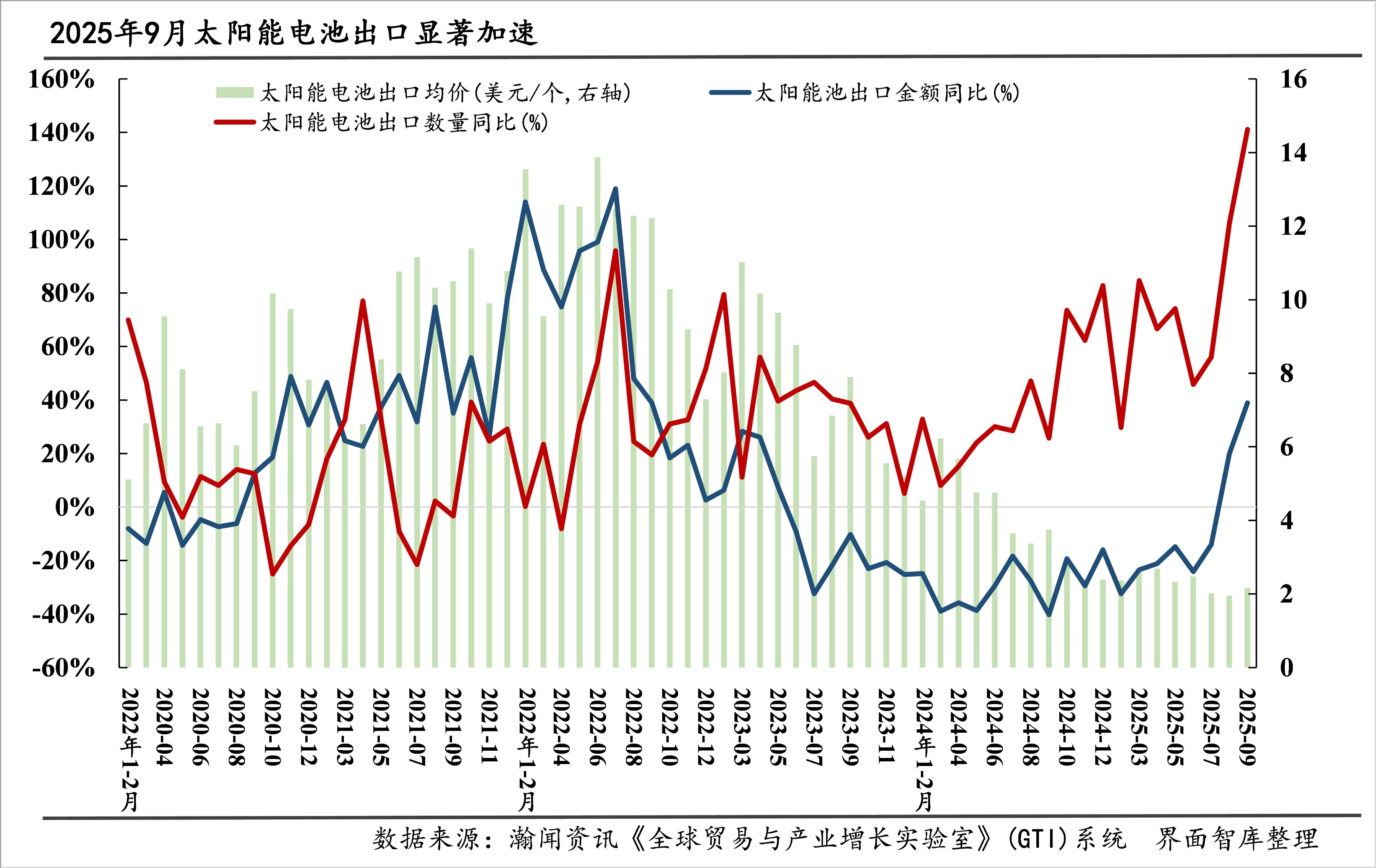 太阳能电池出口同比显著加速。9月,太阳能电池出口数量环比下降13.1%;同比增长141.2%,较8月加快35.1个百分点,较上年同期加快115.4个百分点;出口均价为2.2美元/个,环比上升10.2%,同比降幅较上月略扩大至42.4%;出口金额为28.0亿美元,环比下降4.2%;同比增长39.0%,连续第二个月实现正增长,较8月加快19.0个百分点,较上年同期上升79.2个百分点。