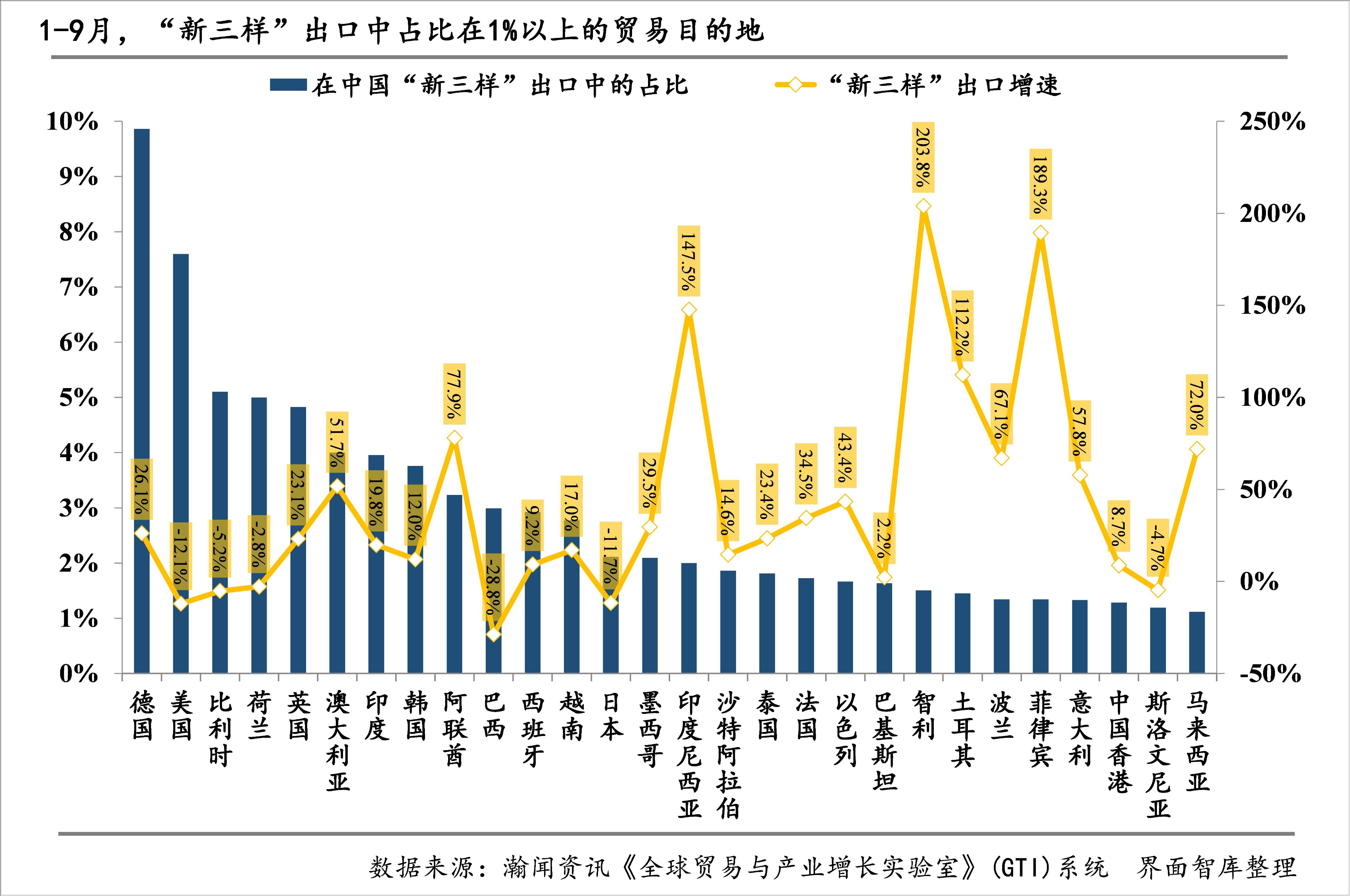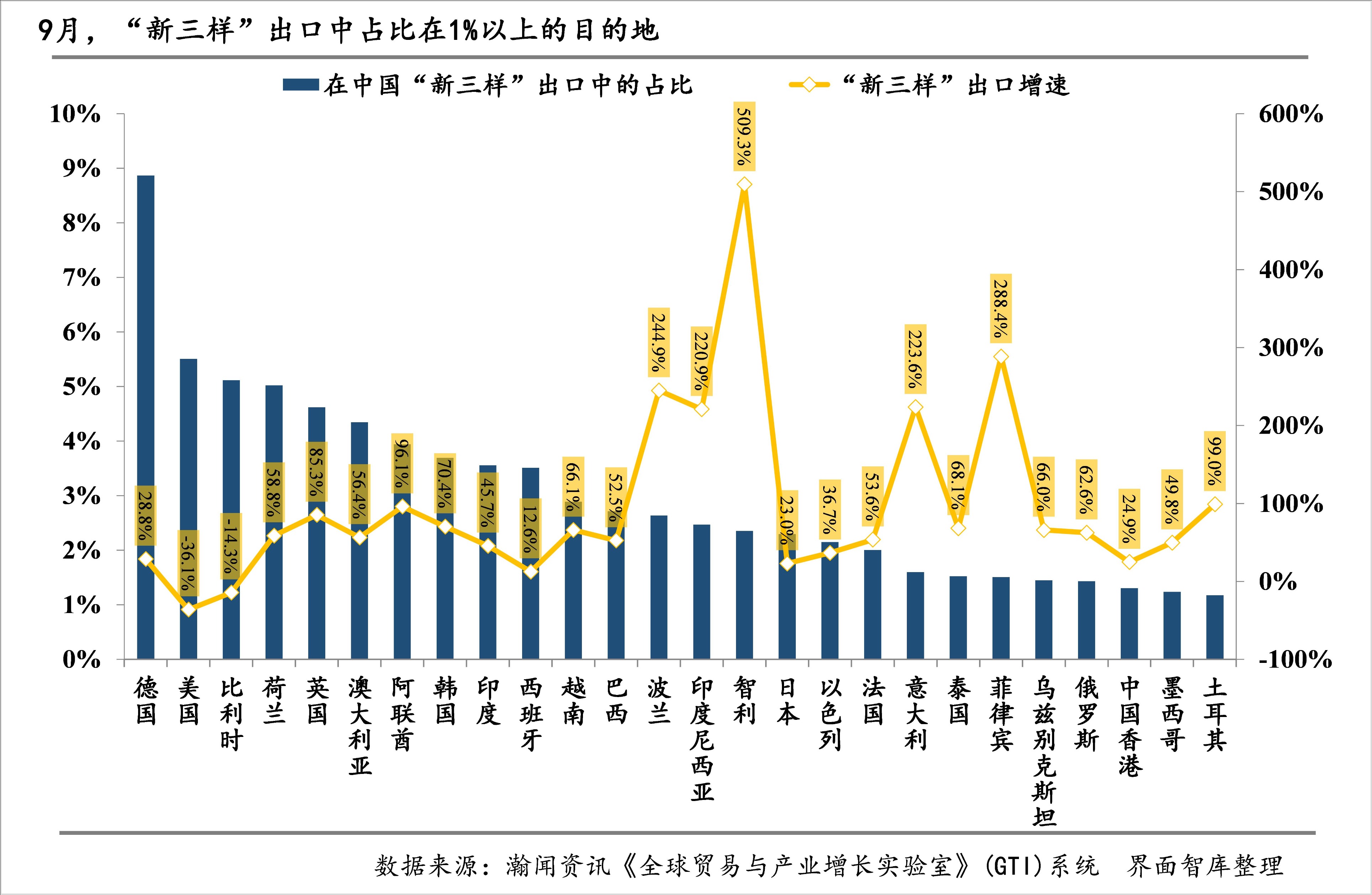 三、英国对9月“新三样”出口贡献最大,德国、智利次之